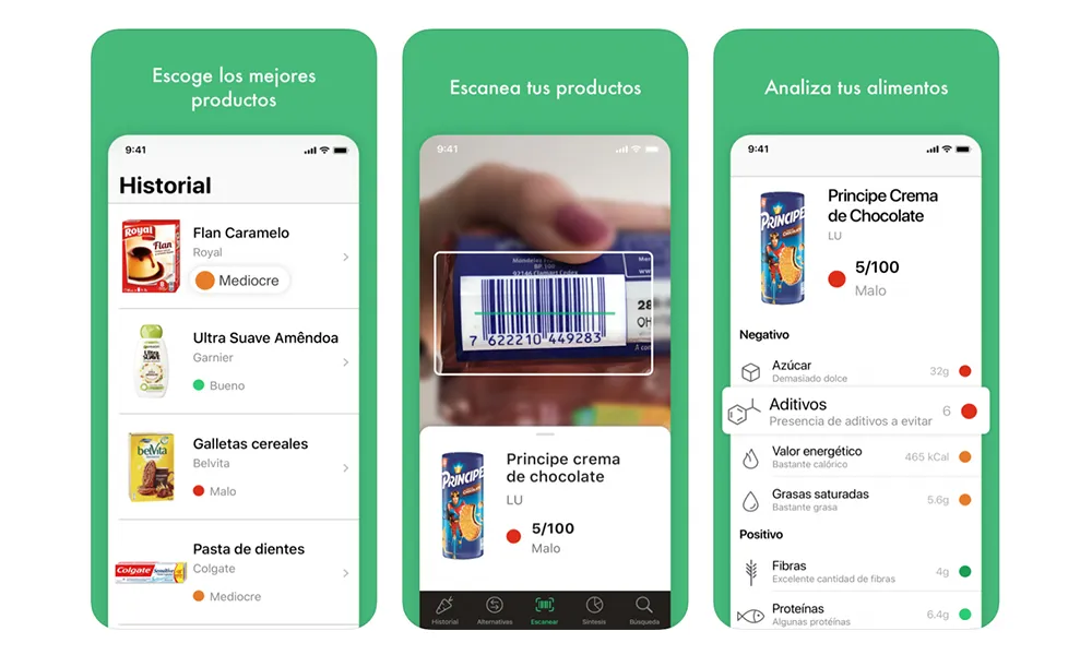 Las ventajas de esta aplicación, valorada con un 4’8 de 5 mediante 22 mil votaciones, es la claridad de la exposición. Con un método de semáforos -de rojo a verde-, rápidamente se puede ver si un producto es saludable o no. Propone alternativas e incluye también productos cosméticos como geles de baño y champús. Esta aplicación de origen francés, es un proyecto independiente que ya cuenta con 18 millones de usuarios.