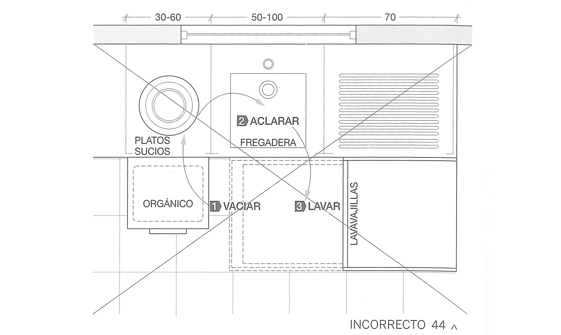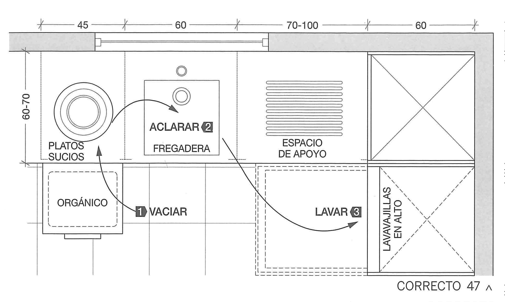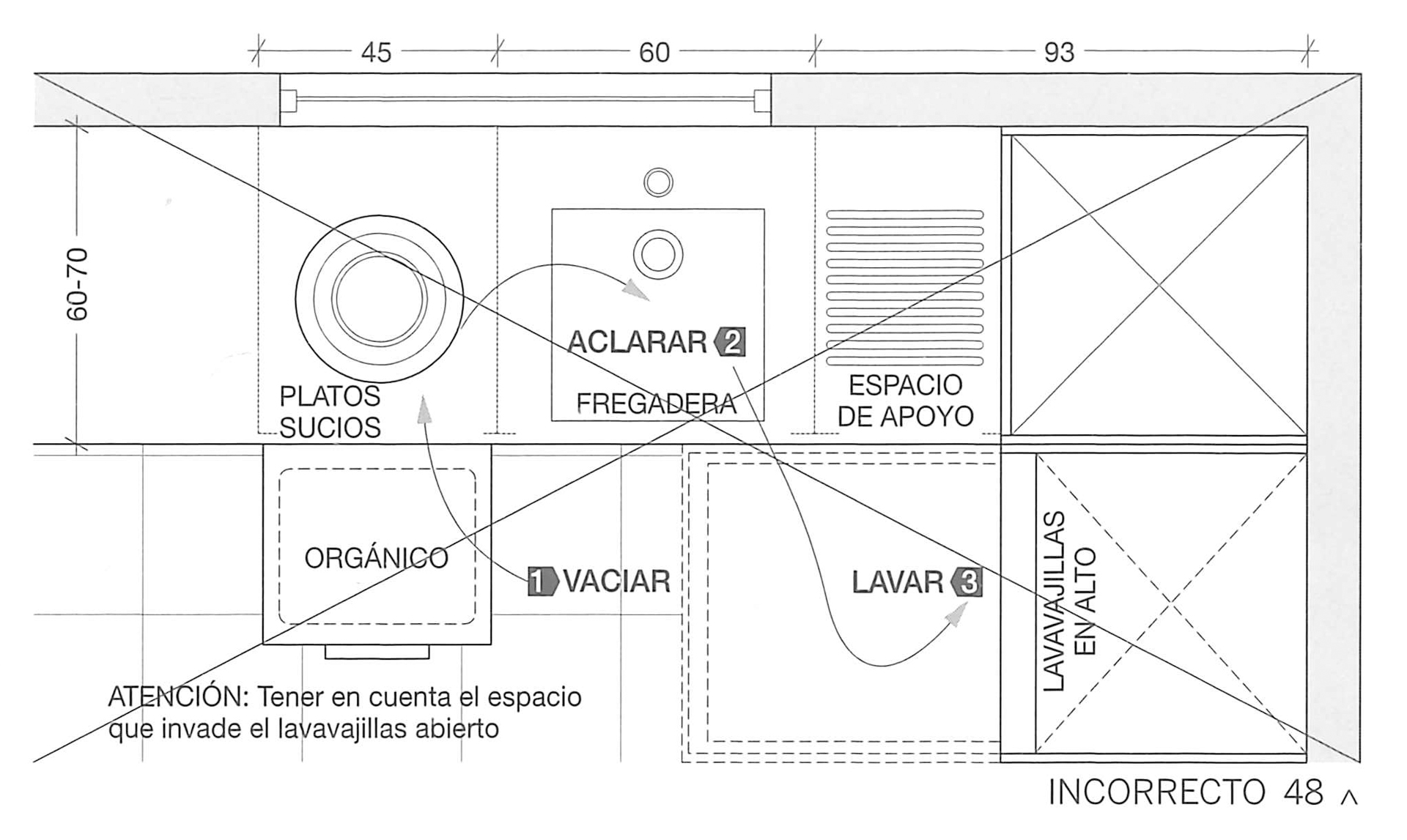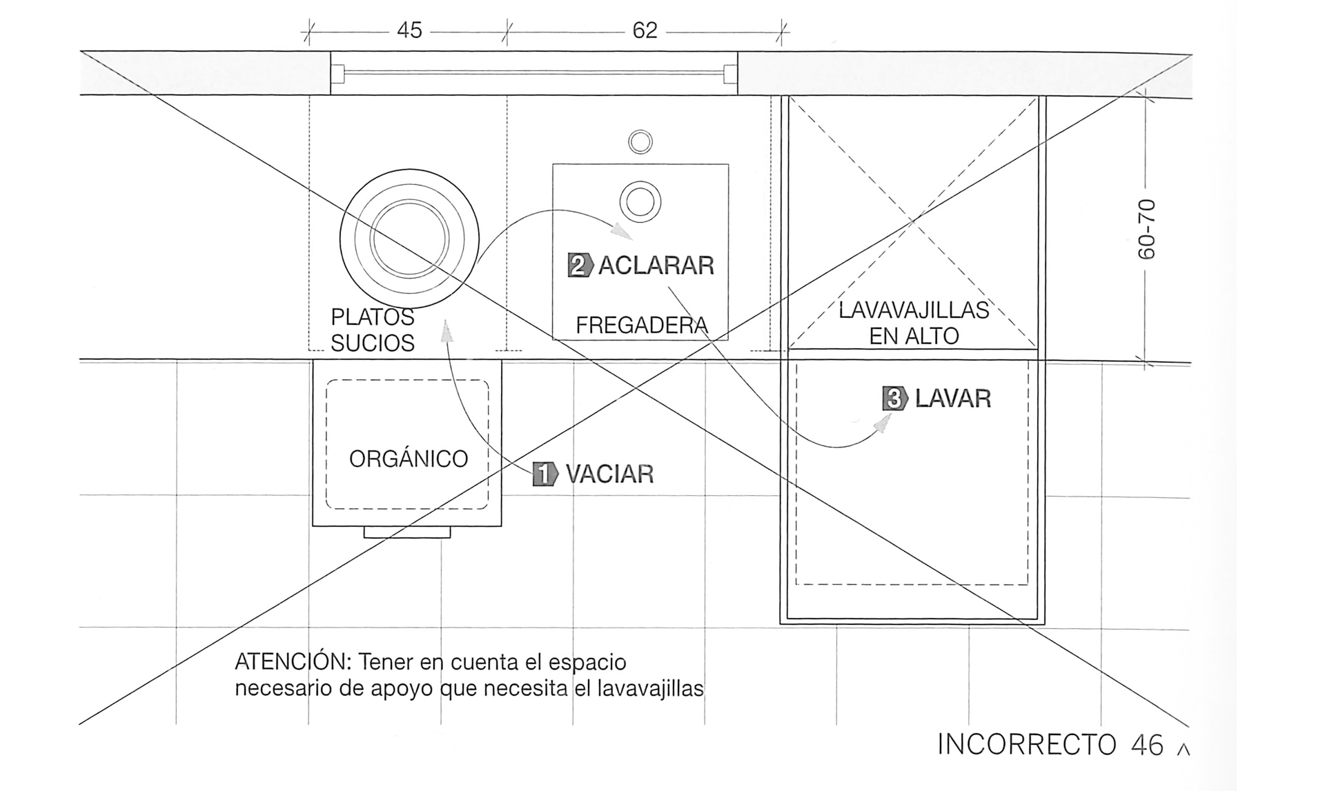 En aquest cas, la distribució de l’espai no facilita la seqüència de rentada perquè la porta del rentavaixella, disposat a altura, impedeix executar còmodament el circuit.Com es pot observar, no queda espai per a estar dempeus manipulant els plats i altres utensilis davant de l’aigüera.