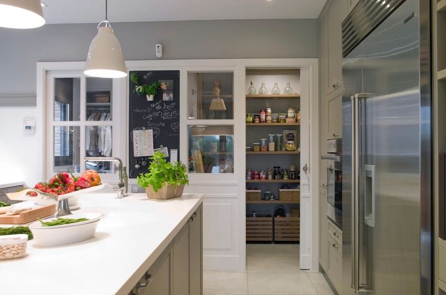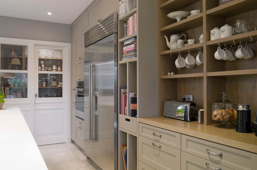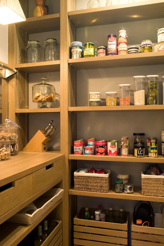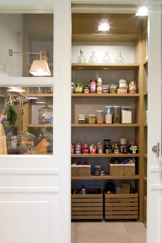La zona rebost compta amb mobles de roure ia les parets també hi va paper amb el mateix color de la casa. Els llums són de vímet. També inclou caixes amb rodes per a productes més pesants i voluminosos.