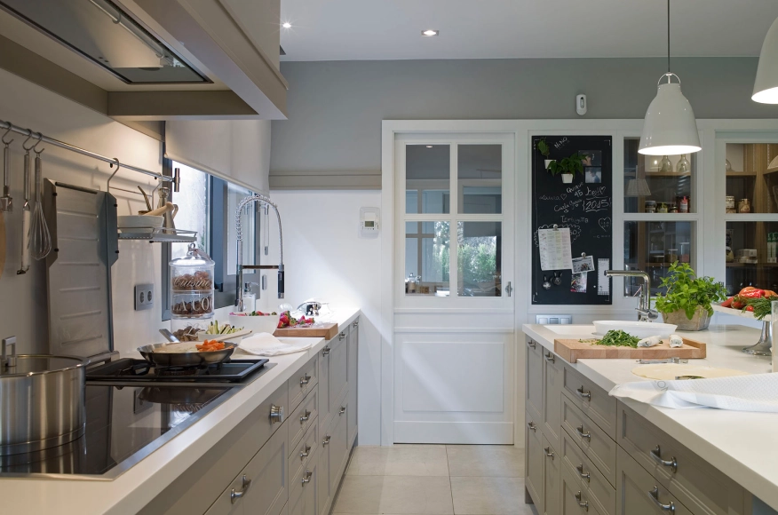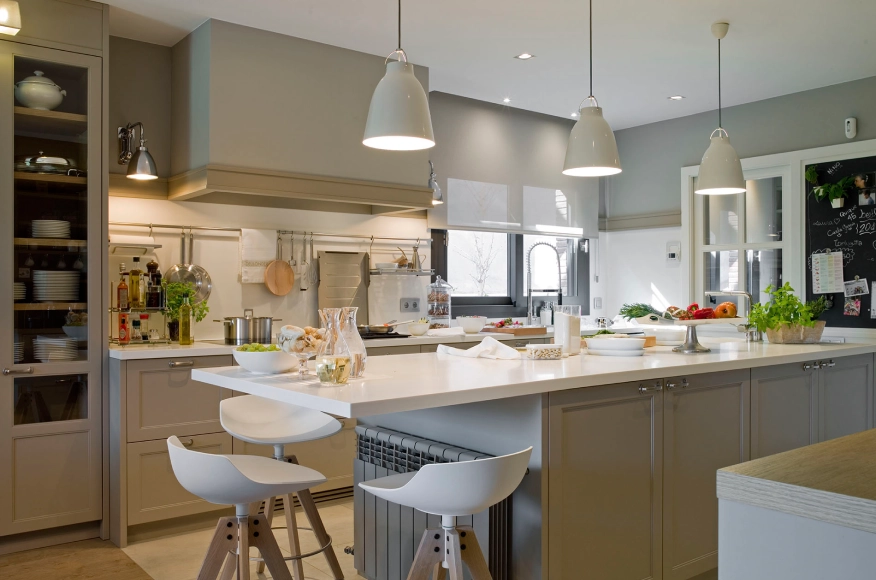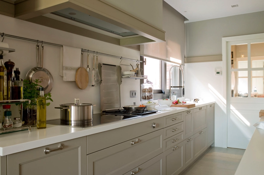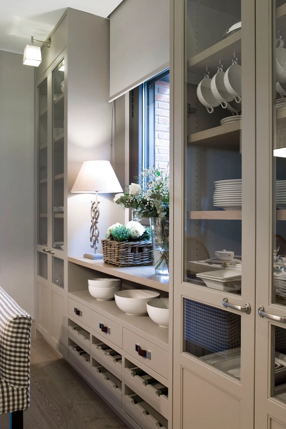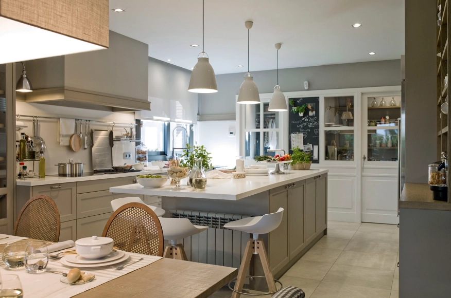 Una sàvia combinació de tons talp i gris empolsat aporten calidesa a aquesta cuina completa que compta amb una illa, que incorpora una barra per menjar de forma informal, i també una coqueta zona menjador, una zona rebost i una altra bugaderia i planxador.