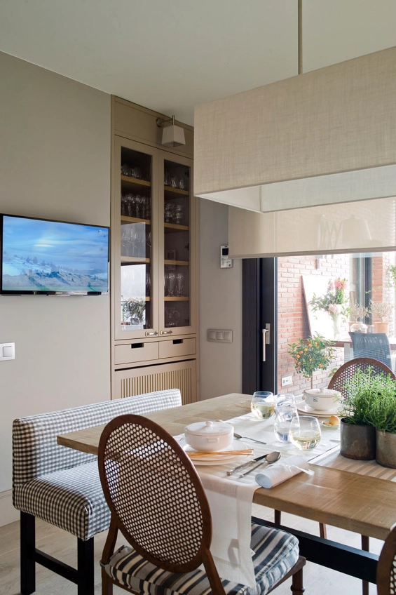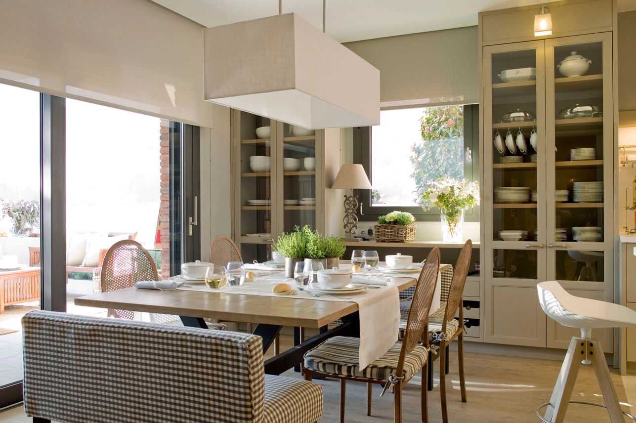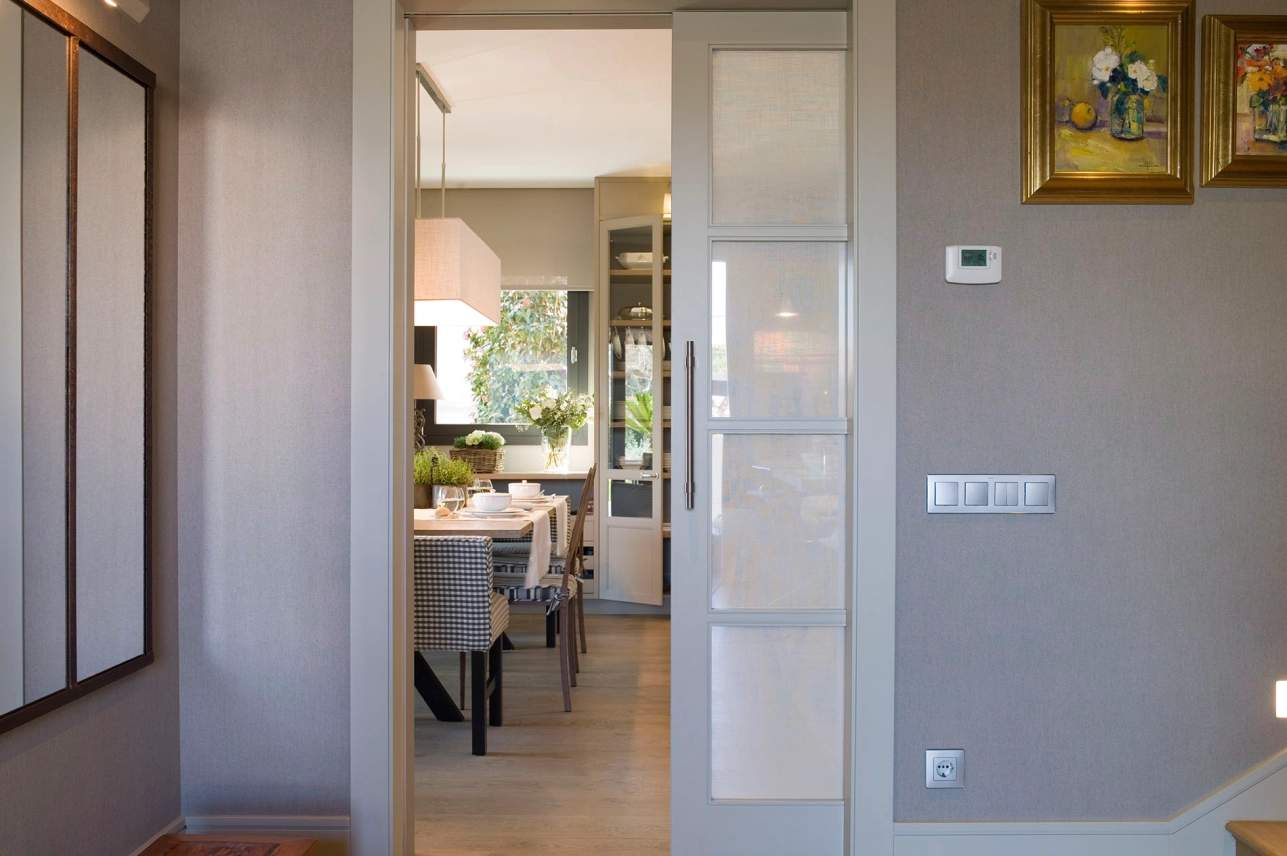 La zona menjador és molt agradable i convida a relaxar-se després dels àpats. La zona queda delimitada amb el terra de parquet i per la diferència de profunditat dels mobles vaixells respecte als de la cuina. La taula és de castanyer amb potes de ferro formant una creuetes per poder entrar bé els peus als extrems. A banda i banda s’han disposat unes butaques entapissades. L’entrada es fa per aquesta porta corredissa amb doble tela.