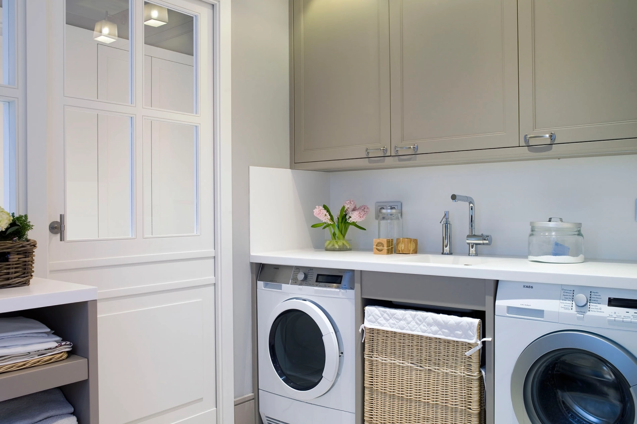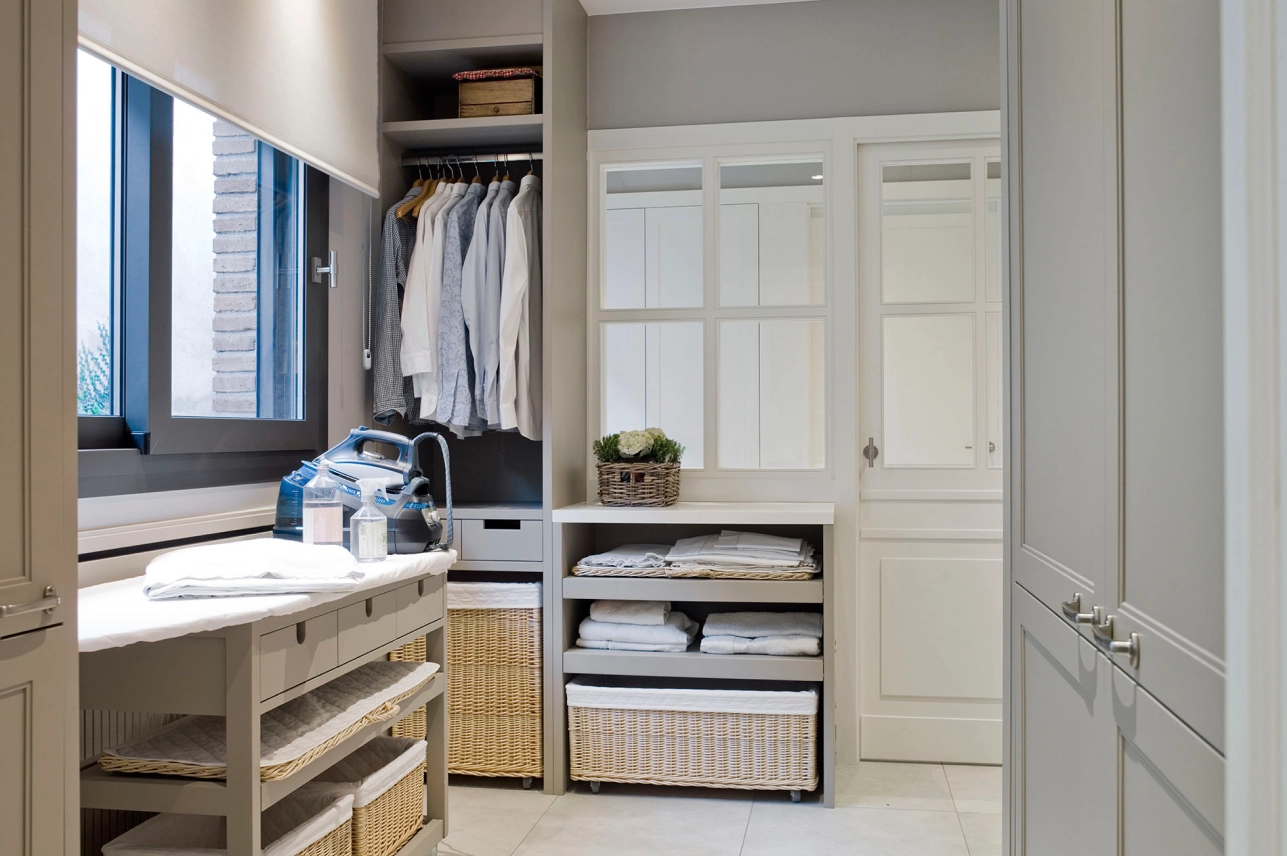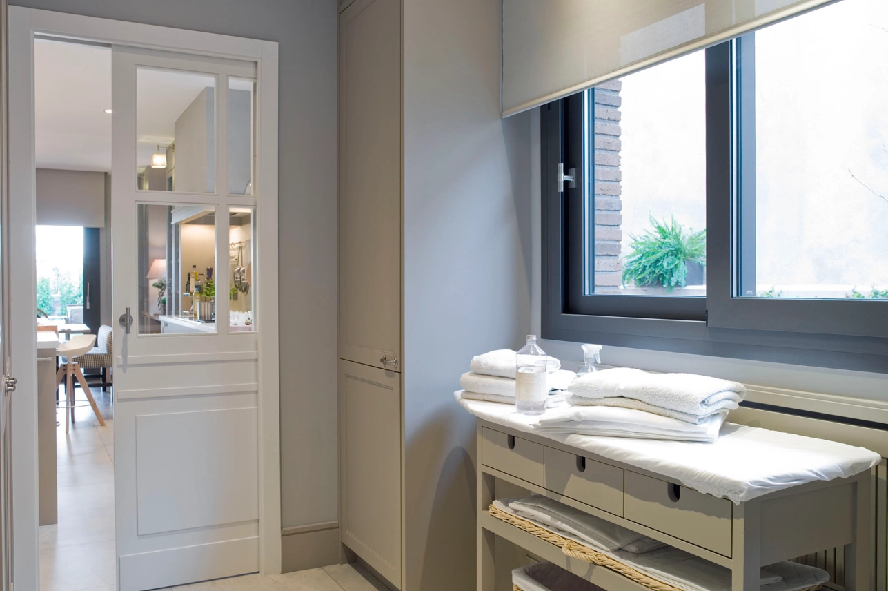 El planxador compta amb una taula de planxar de fusta disseny Deulonder i tota la fusteria segueix el mateix color de la resta de la casa. Un parell prestatges amb les safates extraïbles, cistelles per a la roba per planxar. Els armaris tenen el mateix format de la cuina amb escala, és a dir, una doble motllura fina. Les superfícies són de corian i la rentadora i assecadora van vistes.