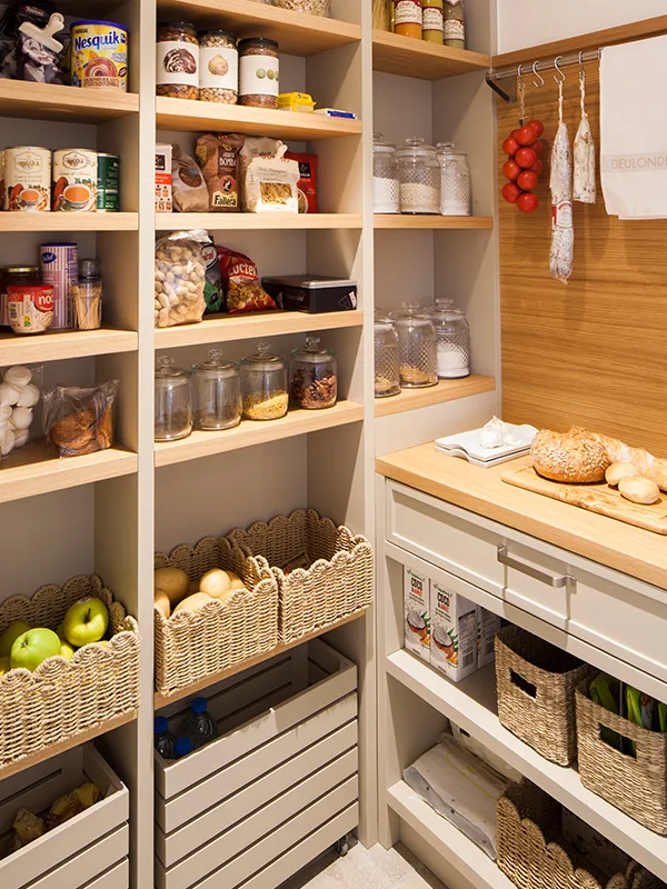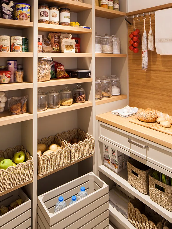 En el rebost s'han col·locat cistelles per a guardar els diferents tubercles i verdures que necessiten ventilació. També una barra per a penjar els embotits. Els prestatges són graduables per a adaptar-se a la grandària dels productes.