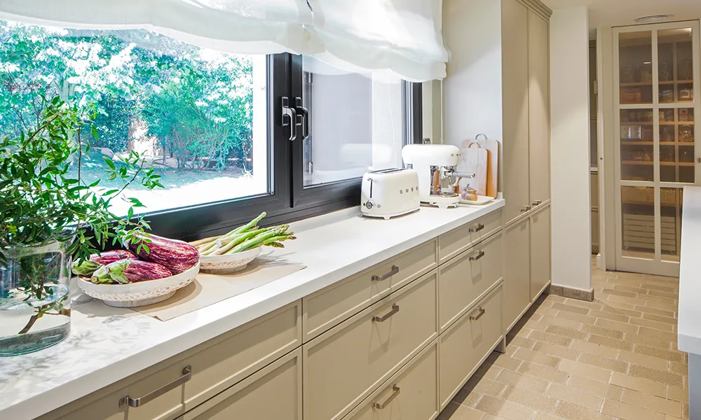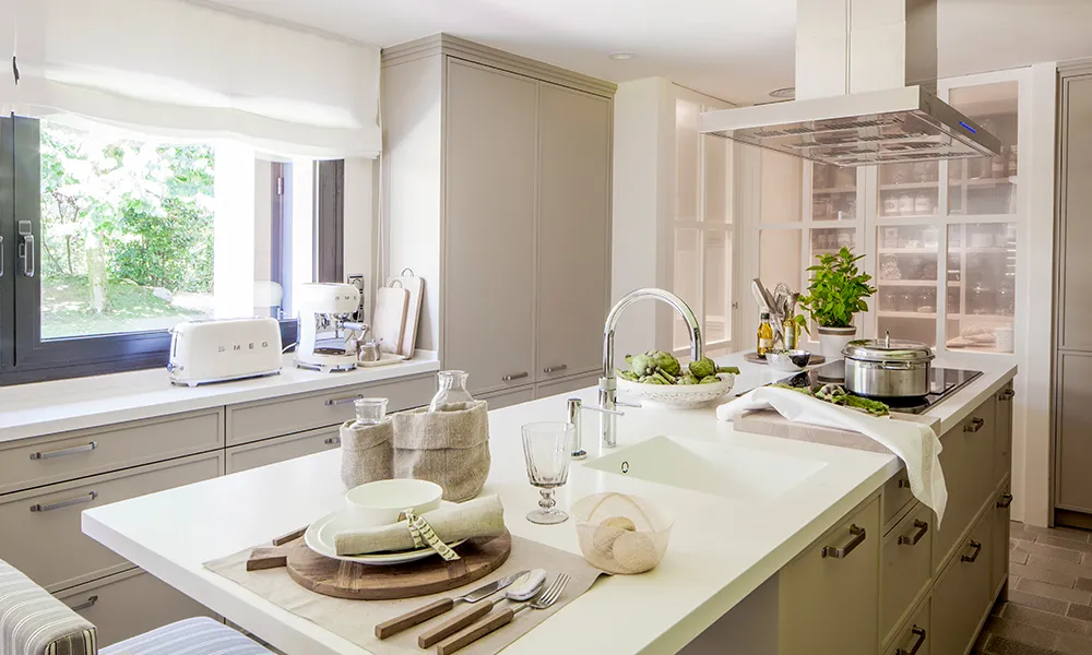 Aquesta cuina situada a Lloret de Mar gaudeix d’un entorn natural privilegiat, de manera que s’ha volgut, en la mesura del possible, fusionar l’espai amb l’exterior a través d’un disseny diàfan i que potencia l’entrada de llum natural. La distribució s’ha dissenyat pensant en les necessitats dels propietaris i té com a particularitat el fet que el rentaplats està elevat per a no haver d’ajupir-se per a posar i treure la vaixella de la màquina. La situació del rentaplats ha determinat així mateix la situació dels forns i de la vinoteca, també elevats. Els sobres són de Corian blanc mentre que els mobles estan lacats d’un color verd suau que reforça aquesta sensació de continuïtat amb l’espai enjardinat exterior. El paviment és de Cumellas, un bonic material orgànic que també s’ha col·locat en la resta de la casa.
