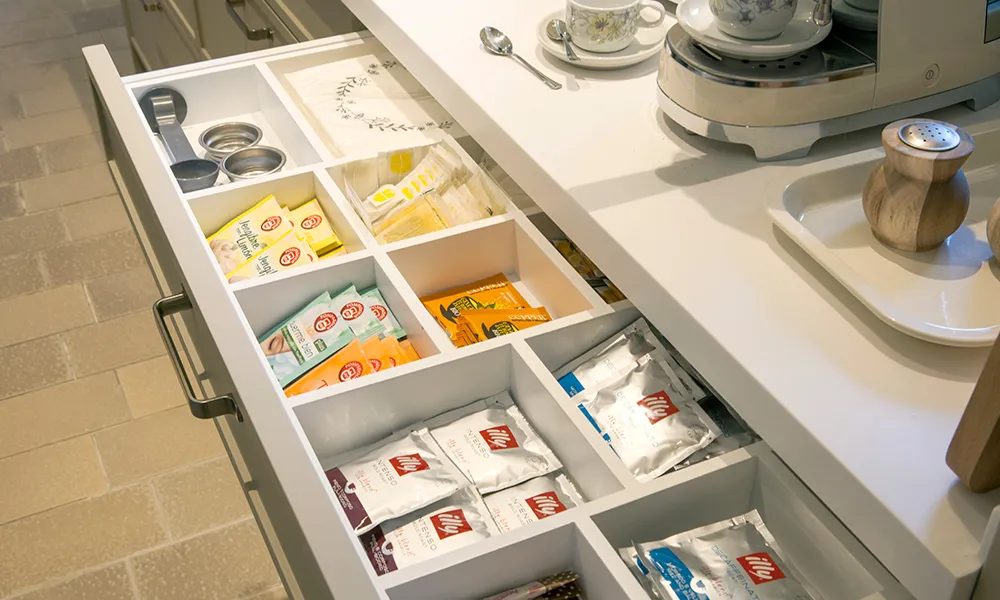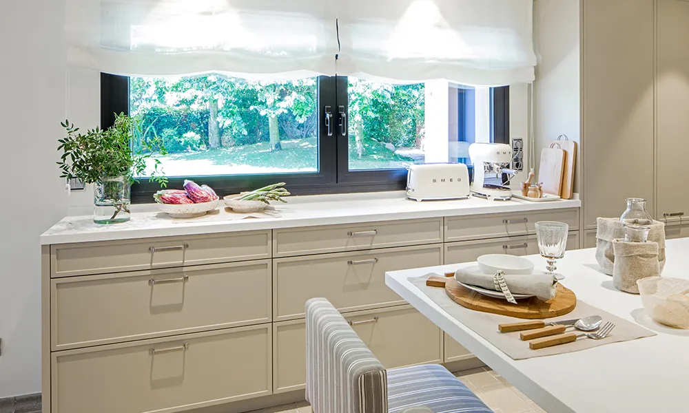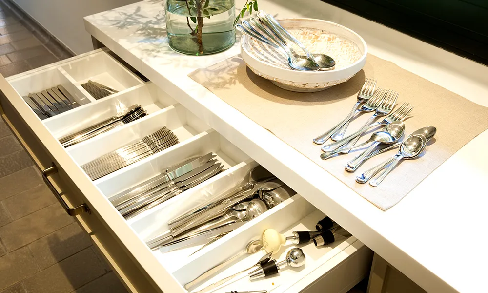Els interiors d’aquesta cuina tan pràctica com harmoniosa també estan pensats fins a l’últim detall. Per exemple, el calaix de la zona d’esmorzar i el calaix de la coberteria, equipats amb separadors fets a mida, segons la grandària dels diferents coberts.
