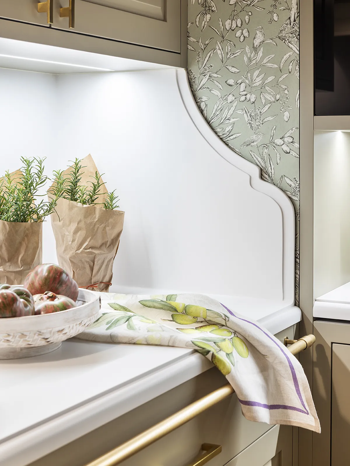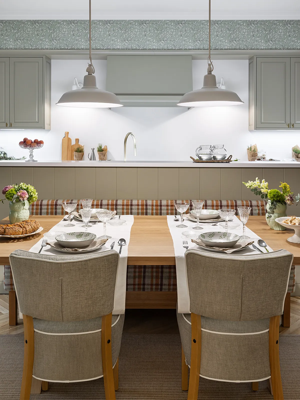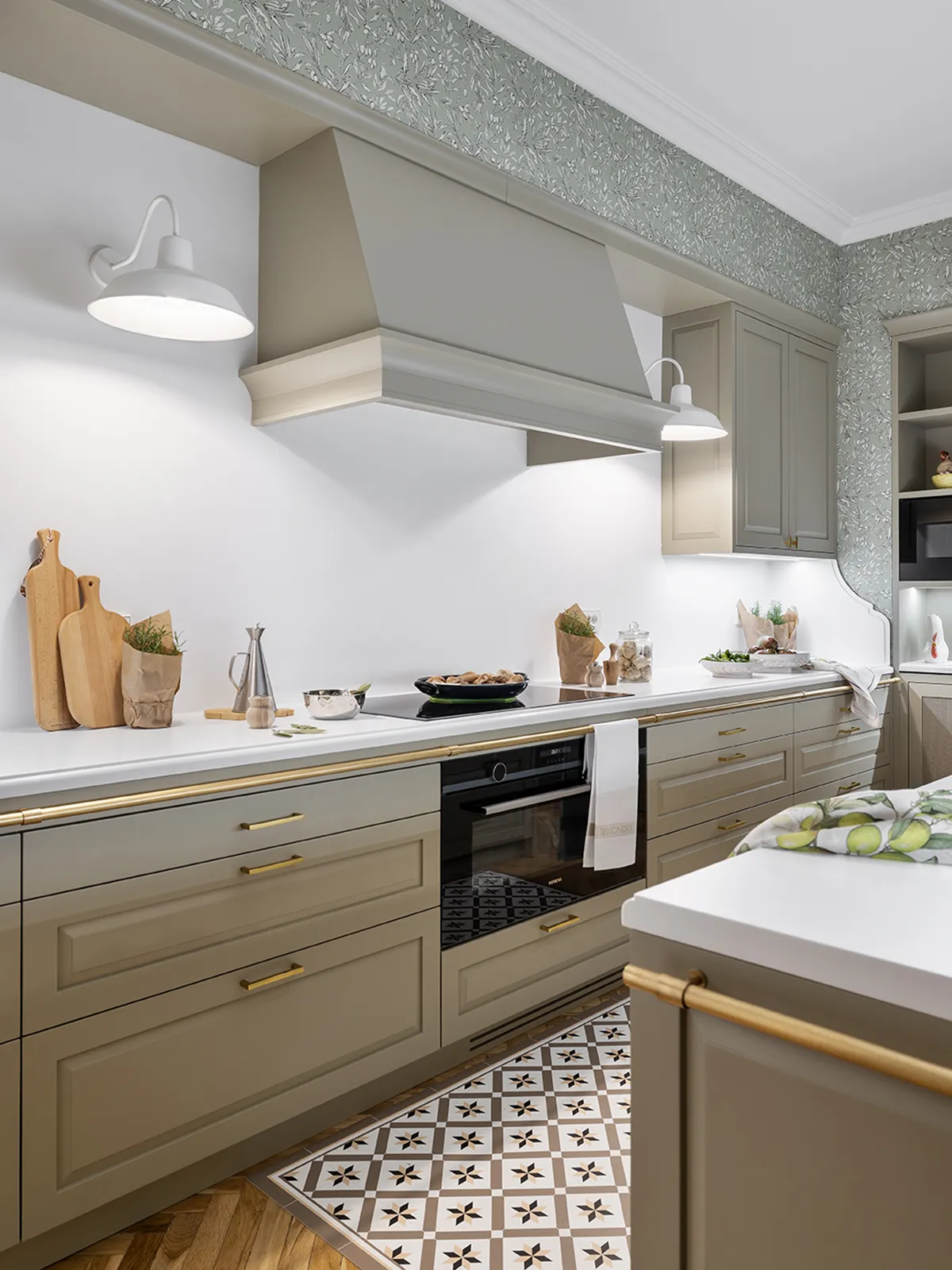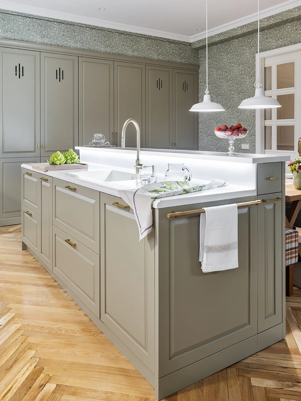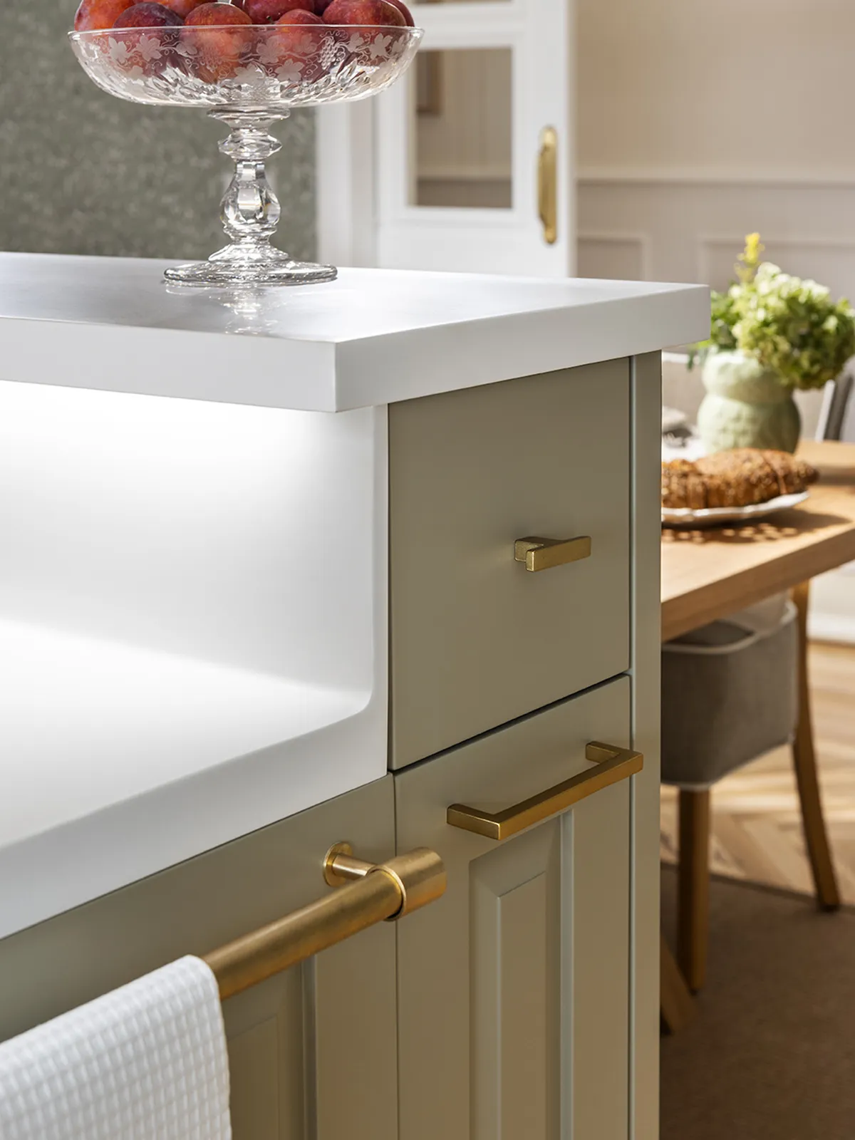 The island contains the sink and dishwasher area. It is built on two levels, which provides a clearer division of the dining area. We’ve also added an LED light that illuminates the entire work surface, while the sides of the island are fitted with additional storage units.