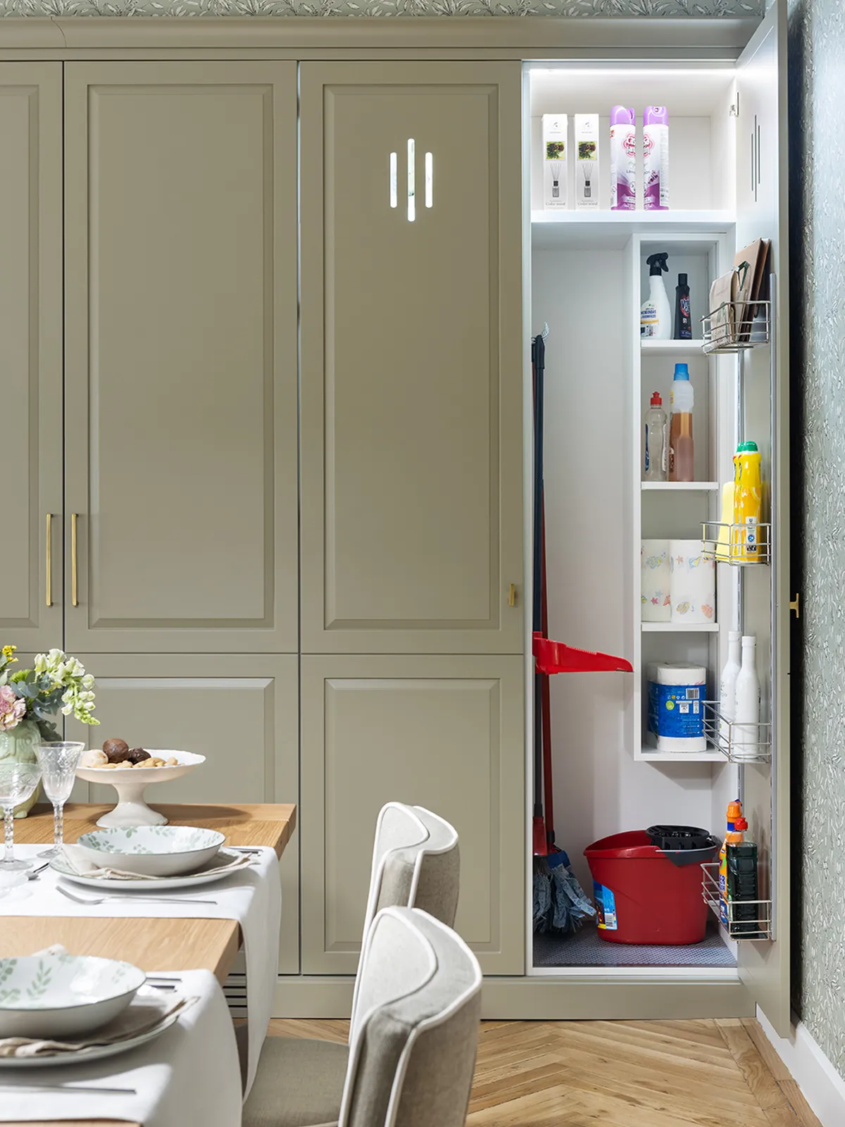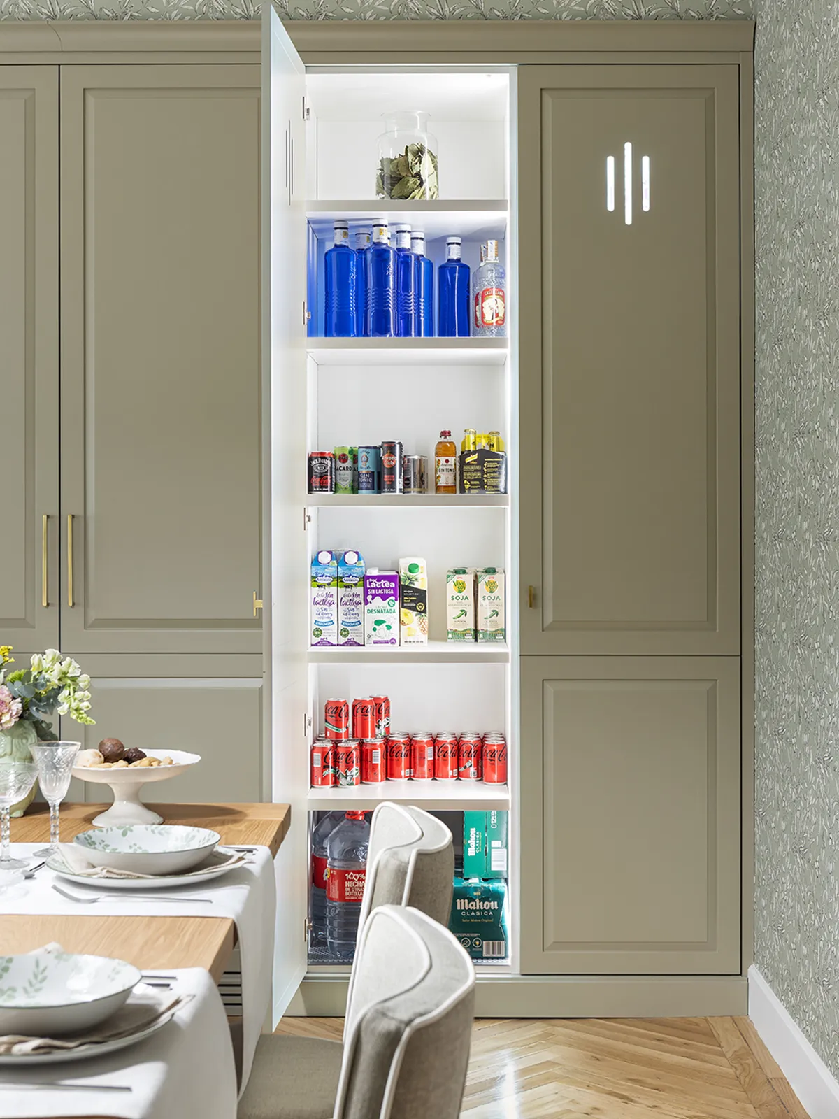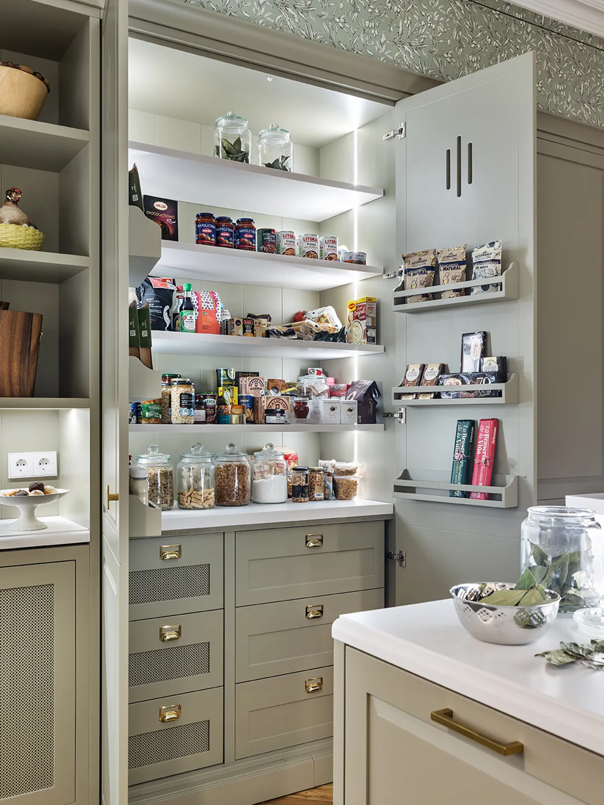 One of the star pieces of furniture is this large pantry cabinet with interior LED lighting and containing six practical drawers.