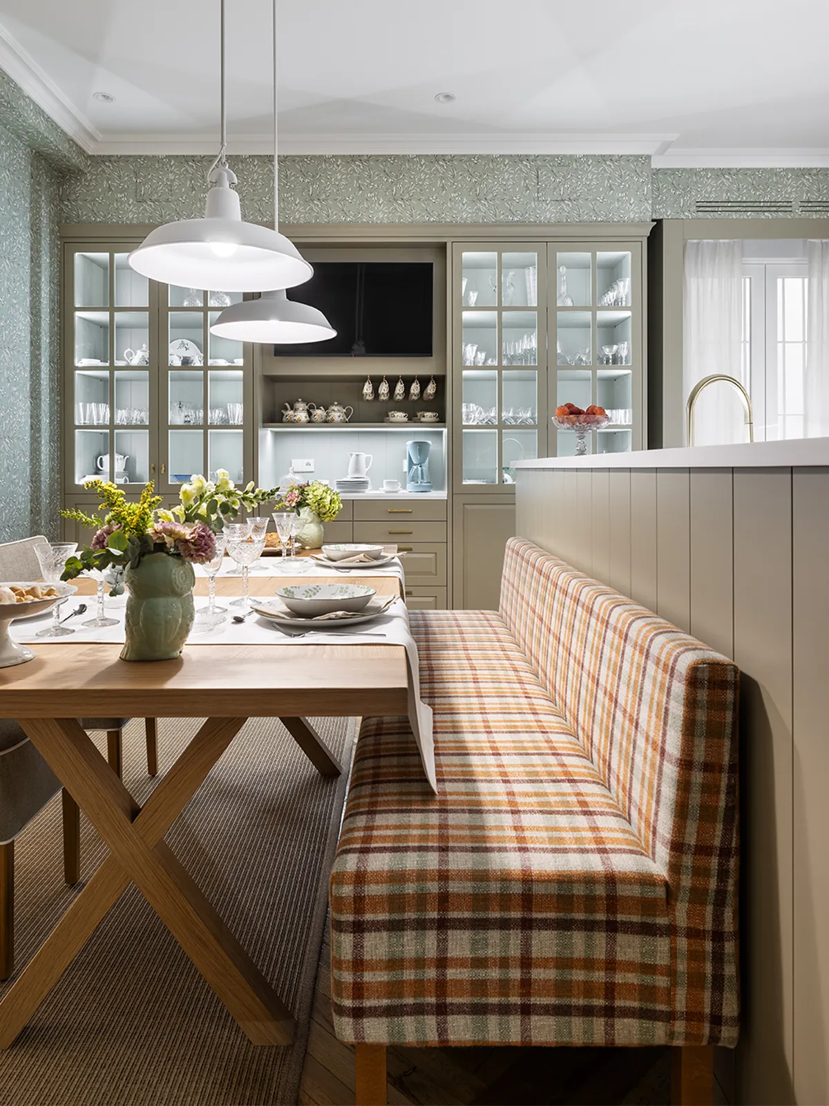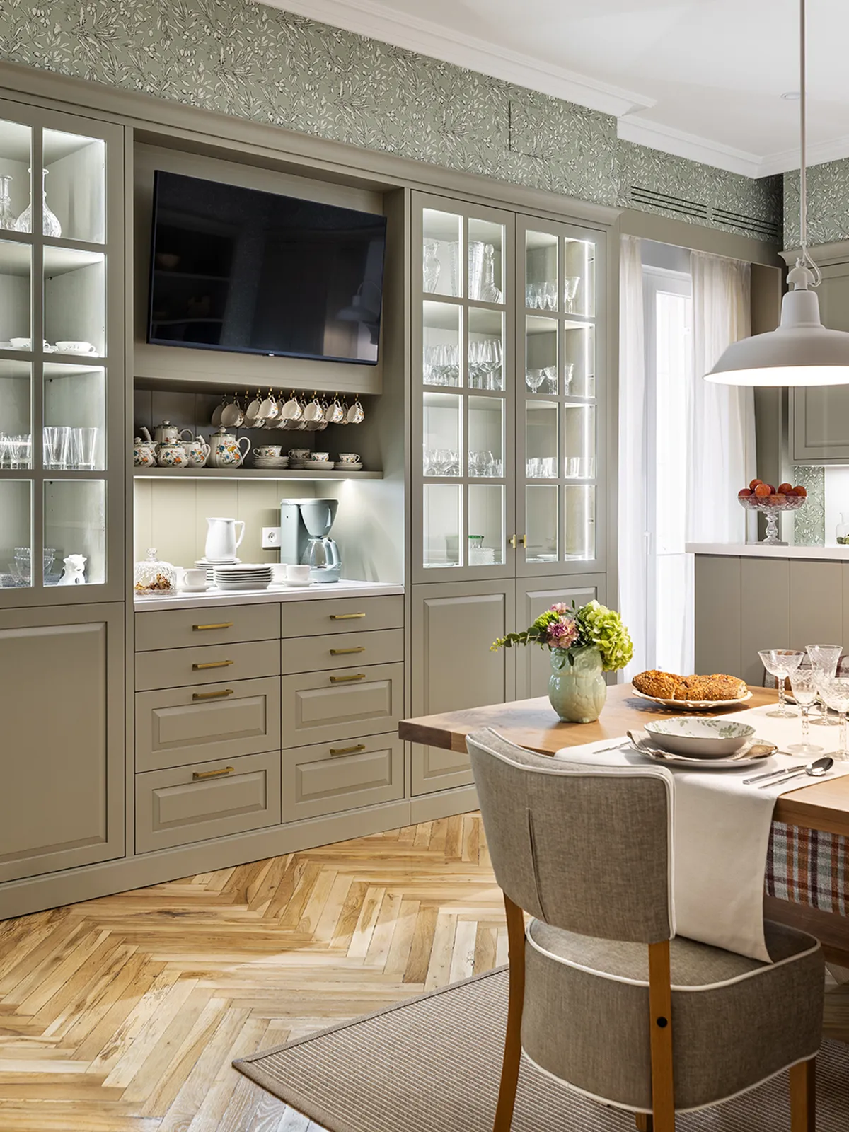 In this area, we have a hidden radiator with a ventilated cabinet painted to match the furniture.