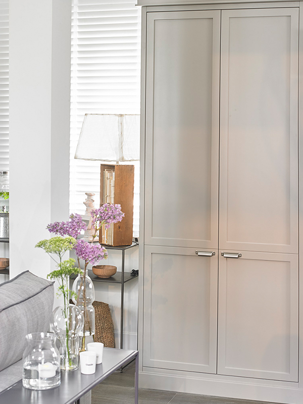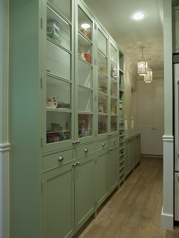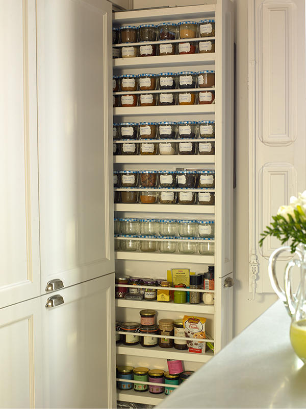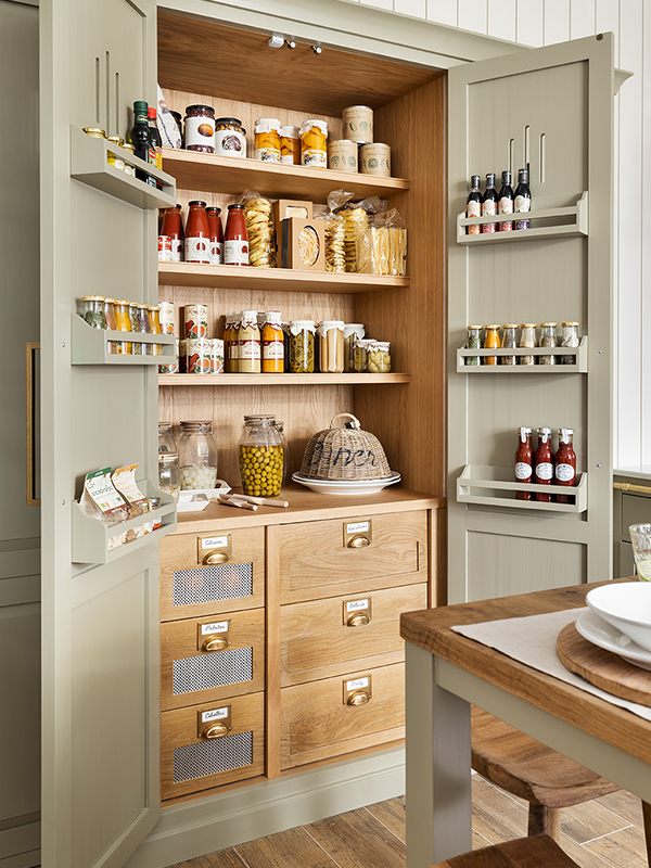 The pantry can be integrated into the kitchen as a tall unit. In this case, the doors have decorative vents that allow the contents to be ventilated.