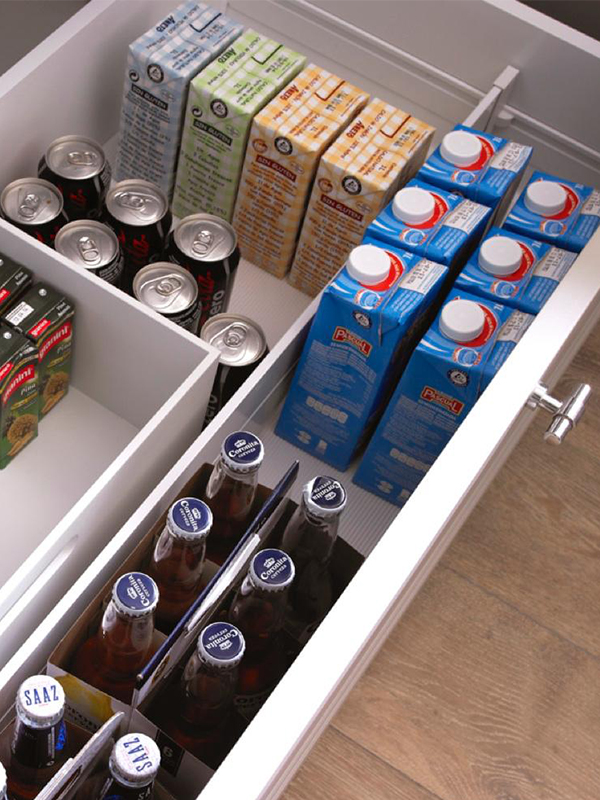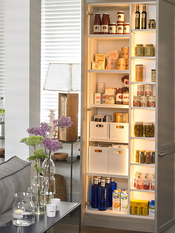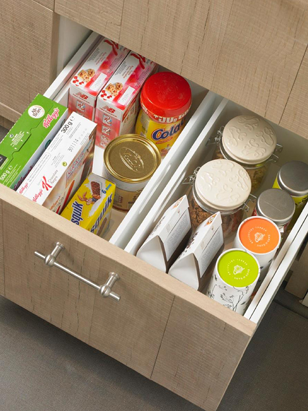 El principio de los muebles despensa, ya sean columna o cajones, es que se adapten a las necesidades de los clientes y a sus costumbres culinarias. Por ejemplo, si se usan muchos productos de repostería se puede pensar un cajón específico para guardarlos de manera ordenada y práctica.