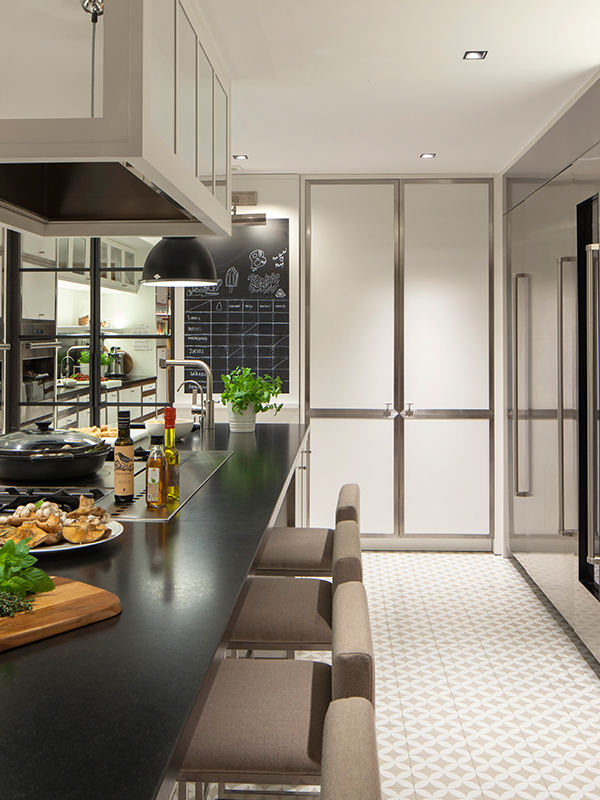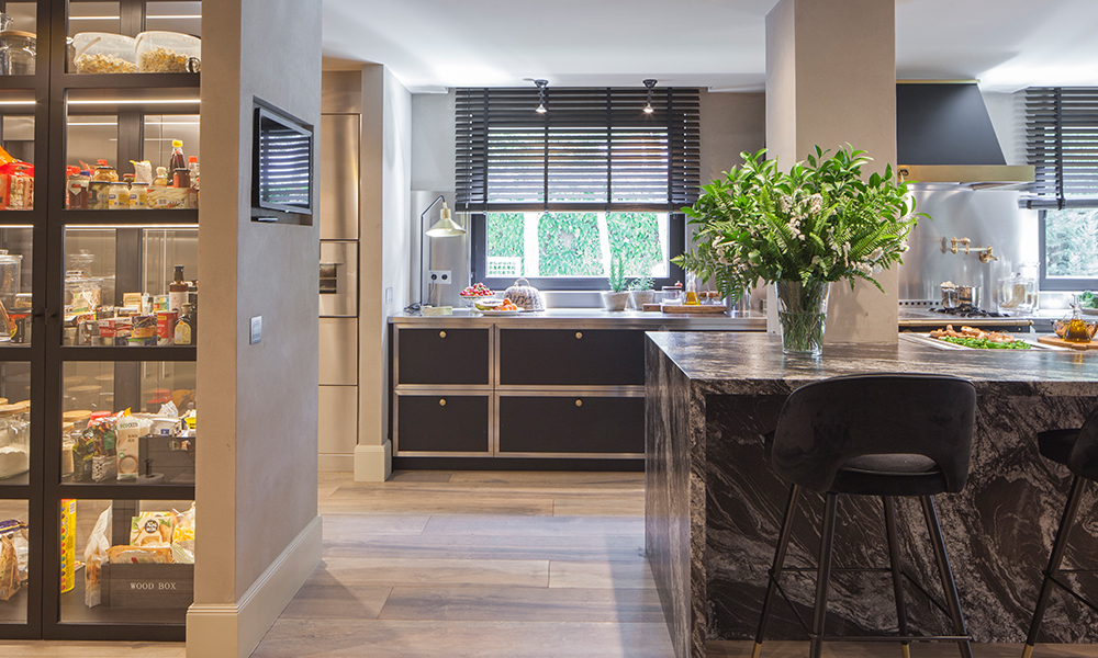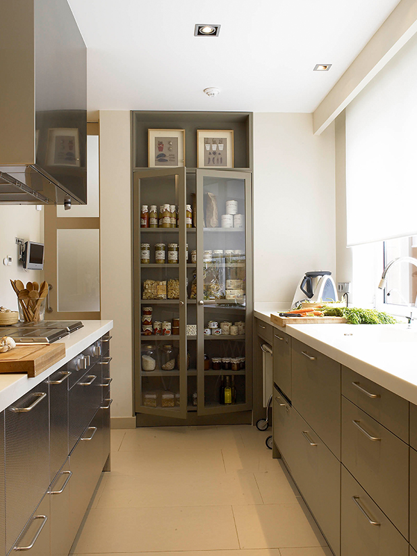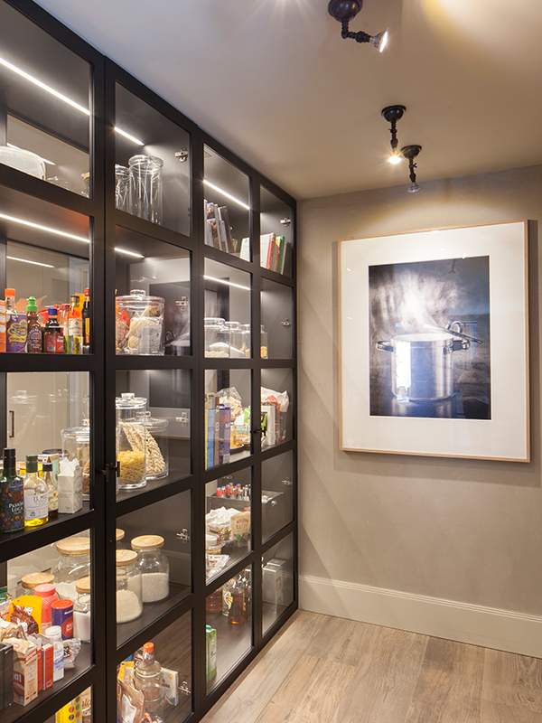 This pantry with glass doors is unique in that it's accessible from both sides, allowing you to keep all your items clearly visible and within easy reach. It's an original and very elegant solution.