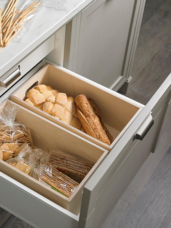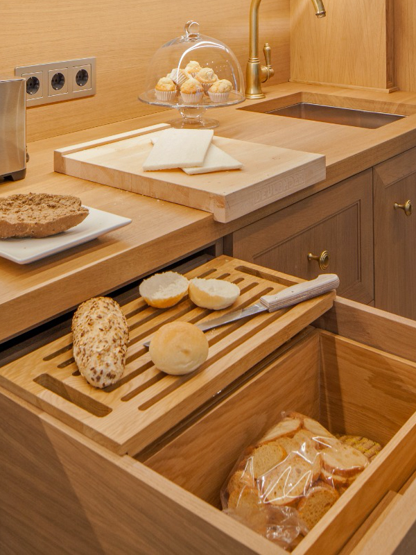 Solutions for storing bread with the cutting board, also for storing baked goods, muffins, toast, etc. In this case, the drawers are usually placed in the breakfast cabinet. The drawers are made of wood, a material that allows for better storage of the bread.