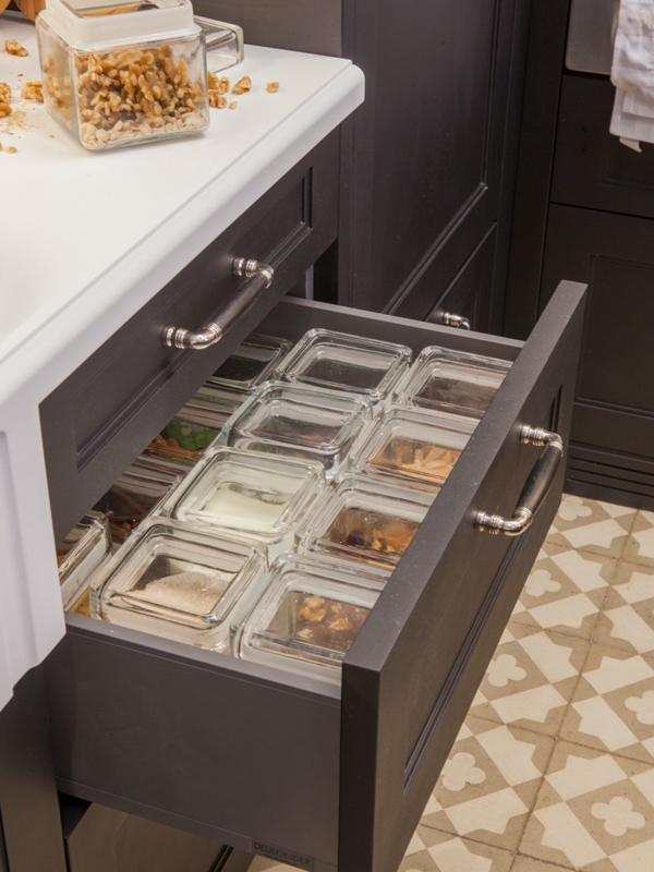 Spices are a separate chapter in the kitchen. For those who need to store a large collection, the possibilities are endless, and in this case, the drawer was made specifically for this brand. In general, it's important to keep them close to the stove, and you can dedicate a drawer where all the jars are visible with their respective labels.