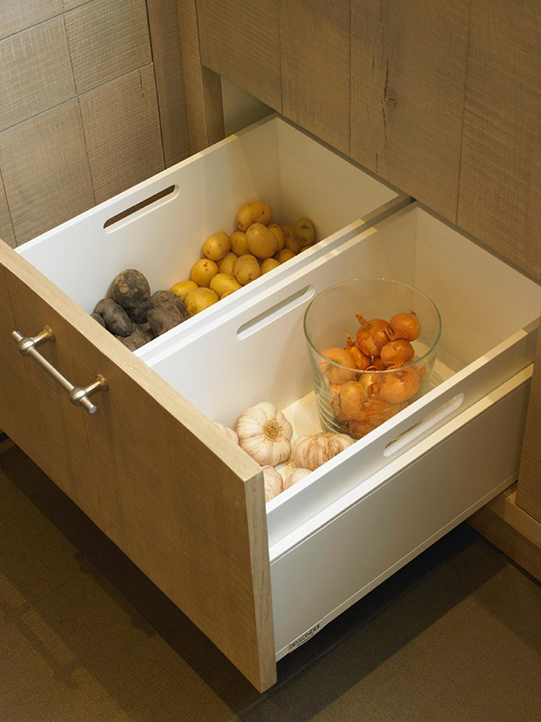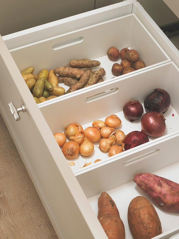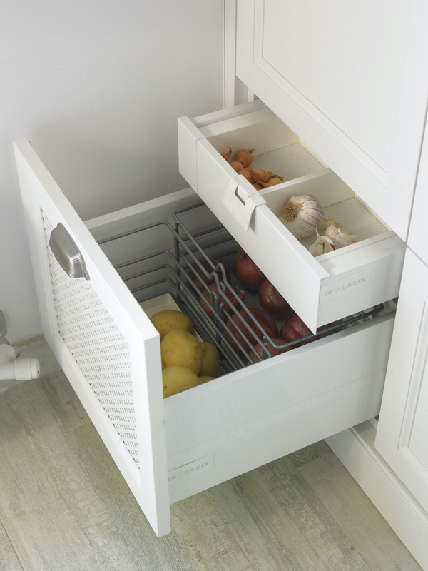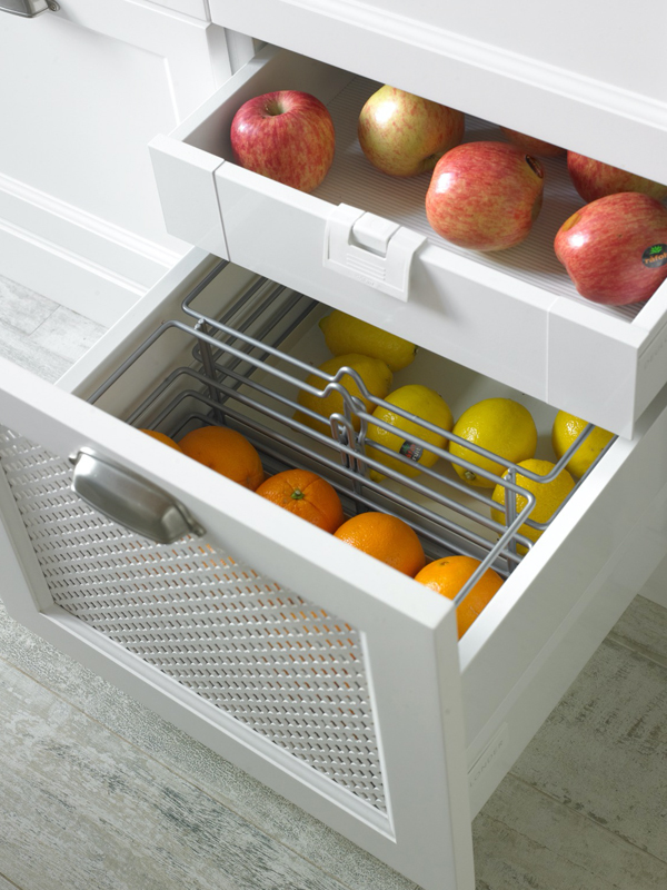 Low drawers with a mesh door allow you to store items such as fruit, potatoes, onions, or oranges. They also include an interior drawer for smaller items such as garlic, all well ventilated.