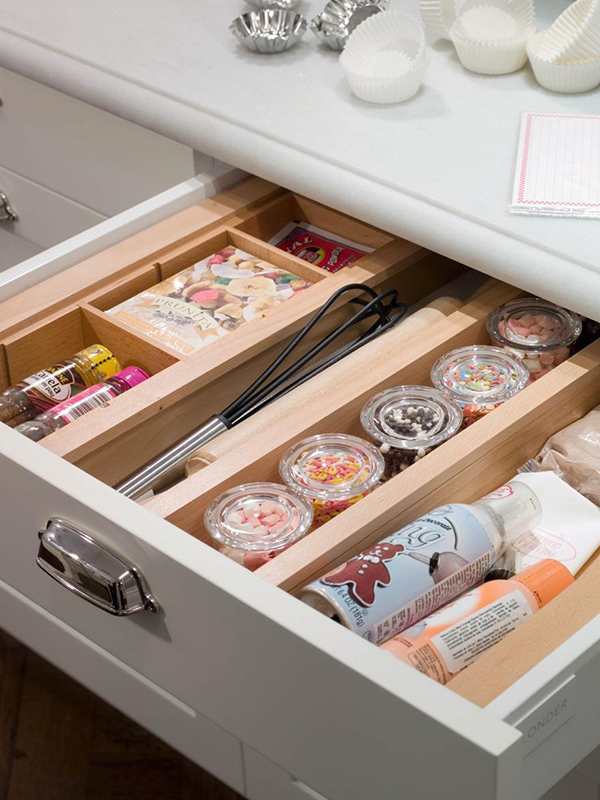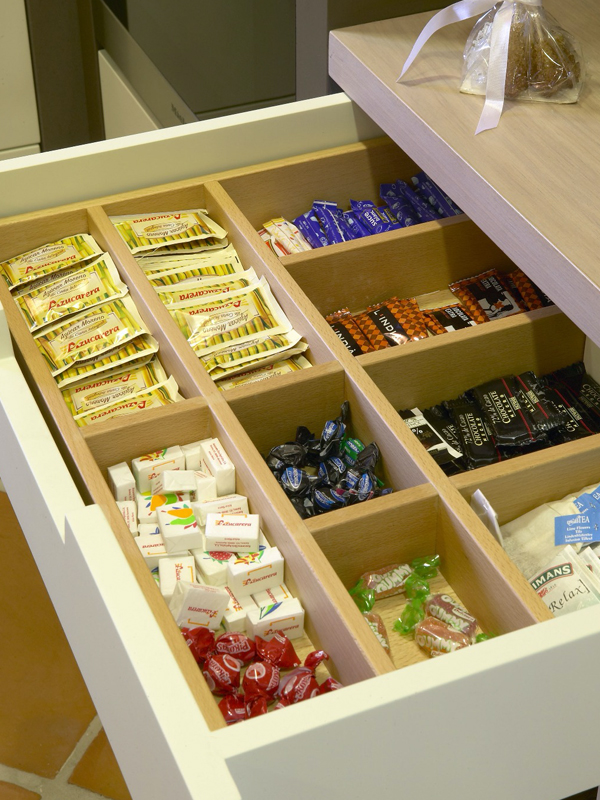 Dividers make organizing easier and maximize space. In this case, they're for different types of tea, sugar, and chocolates.