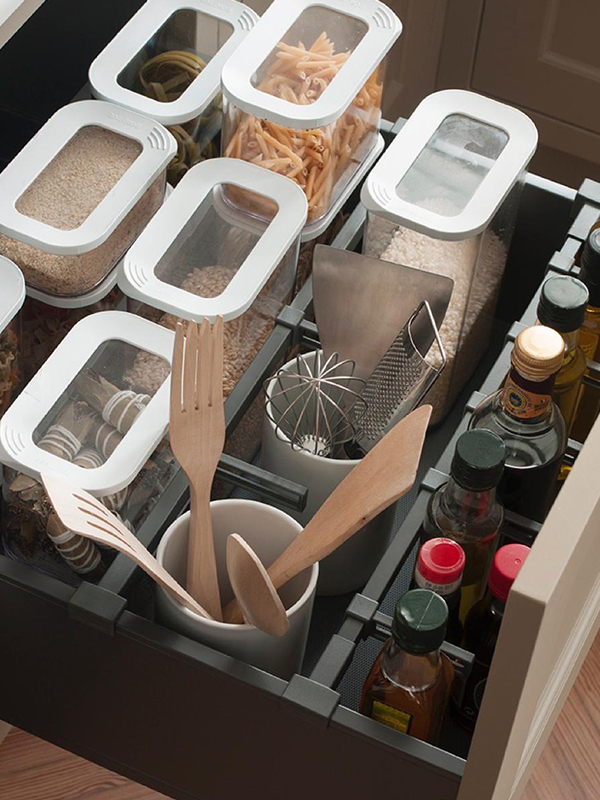 A drawer for storing bulk products again with the transparent container solution. Keeps products organized, visible, and accessible for cooking.