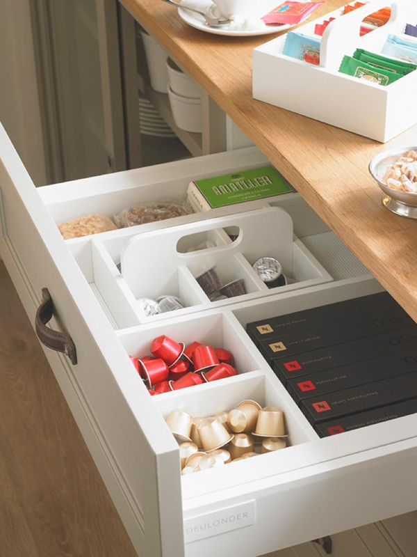 Deulonder offers drawers with dividers designed for specific items, such as coffee capsules. The drawer is located under a top designed for preparing coffee and tea.