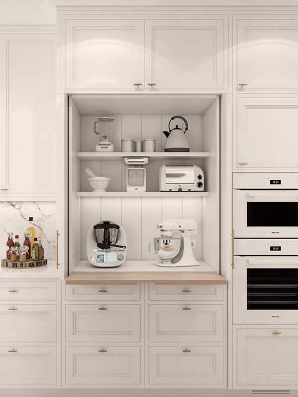 Vista del mueble para pequeños electrodomésticos opción con 6 cajones para ingredientes. La puerta es retráctil y también tiene una repisa extraíble.