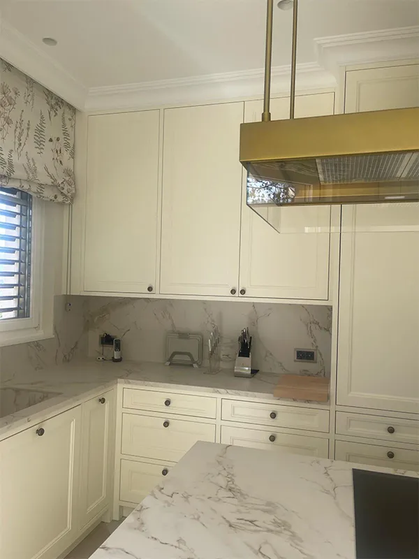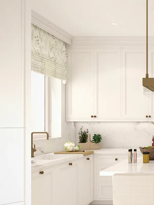 Una característica de esta cocina es que todas las paredes van forradas de madera moldurada. Las cornisas y las paredes tienen el mismo color de los muebles, un blanco roto. Ahora bien, todas tienen tantos ángulos irregulares que supuso un trabajo muy laborioso poder mantener las simetrías y la armonía.