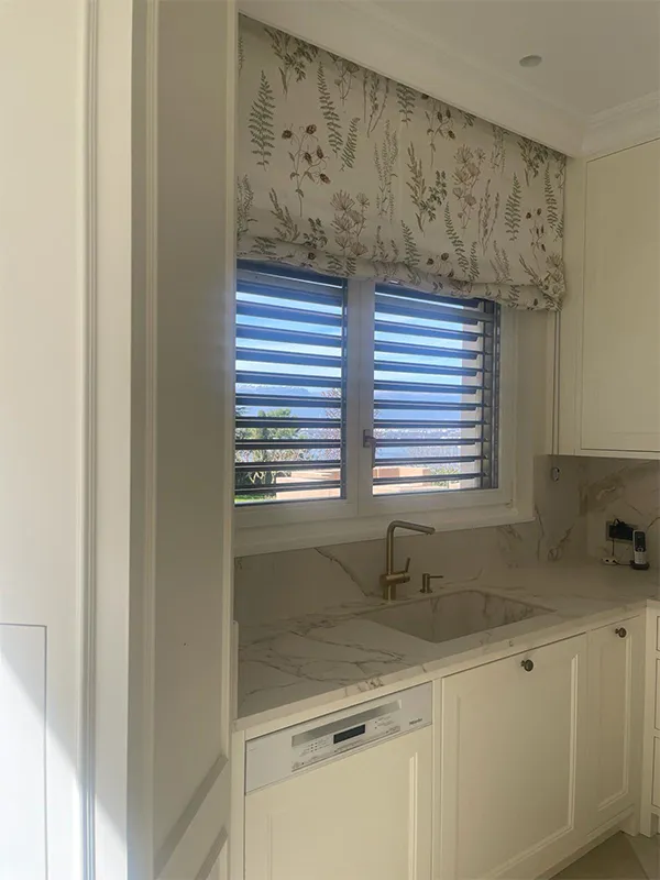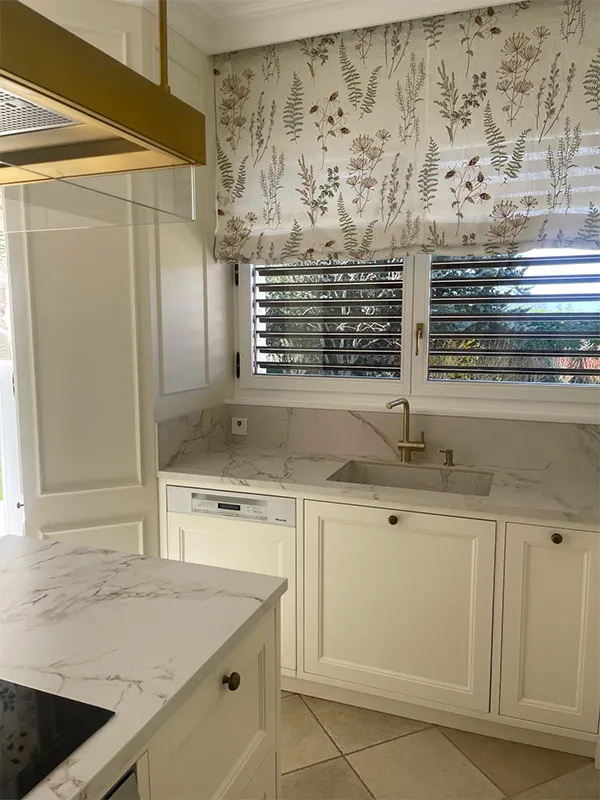 Las cortinas, vistas de cerca, tienen como un bordado y dan un toque muy personal al ambiente. Por otro lado, los sobres son de Dekton-Entzo, y se trata de un material muy actual, especialmente resistente y bonito.