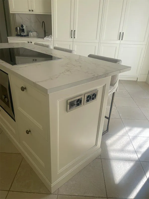 La isla cuenta con varios enchufes instalados en un lateral y también tiene una parte de barra volada para poder comer de manera casual sobre taburetes.