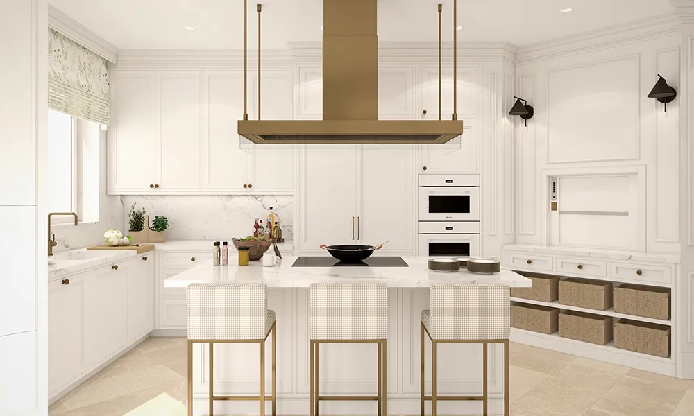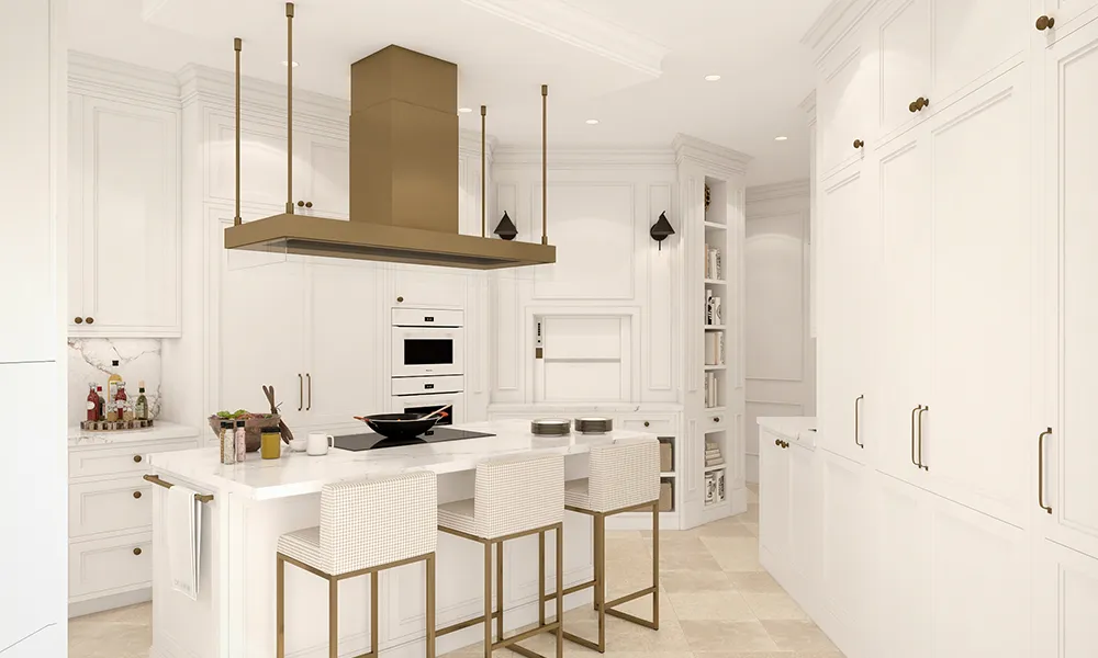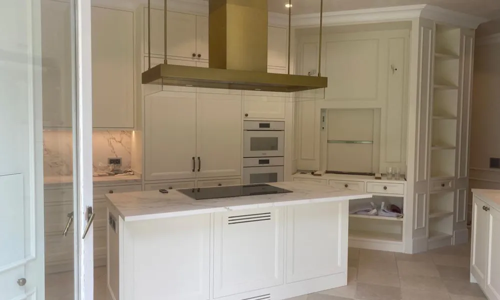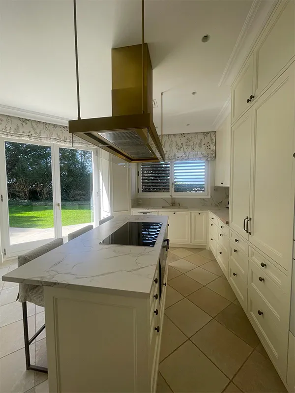 La isla para cocinar con una gran campana. Detrás de la cocina están los frontales con los hornos y un armario con una puerta retráctil para guardar los pequeños electrodomésticos.