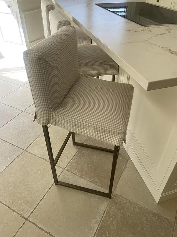 Detalle del taburete, cuyas fundas se pueden sacar para lavar fácilmente. Las patas son de acabado latón a conjunto con la campana y los tiradores.