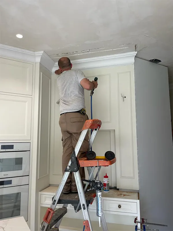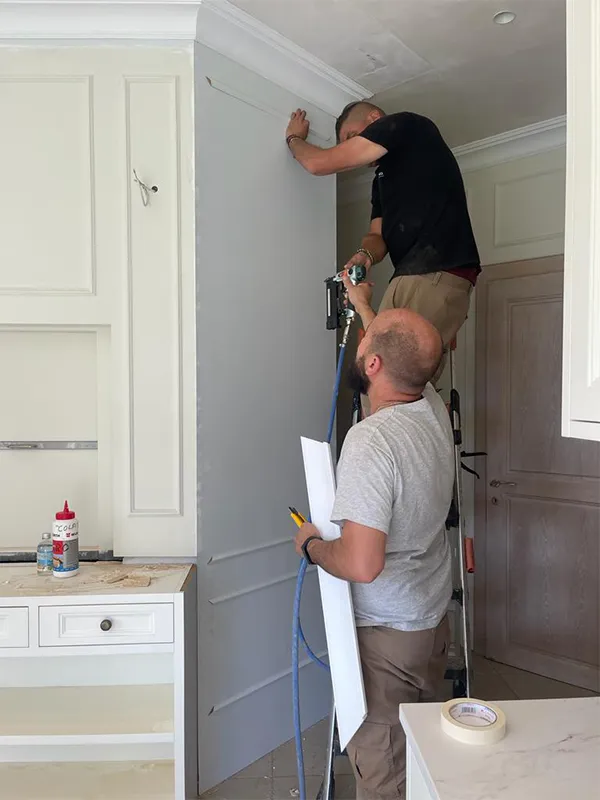 Los operarios están poniendo las cornisas y se puede apreciar cómo van forrando las paredes.