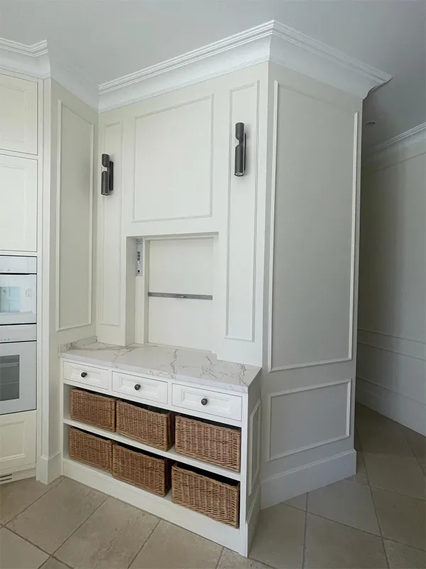 El cliente quería un espacio para poder guardar tubérculos y fruta ventilados, así que se pusieron estas cestas de mimbre debajo del mueble.