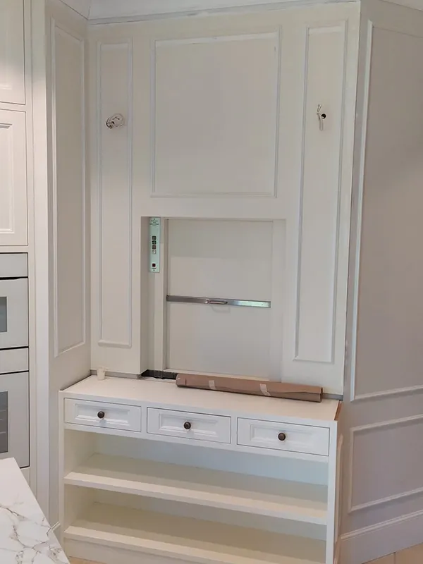En la zona del montaplatos, con el mismo tono lado de blanco que el resto del mobiliario, se ha aprovechado para poner un mueble bajo.