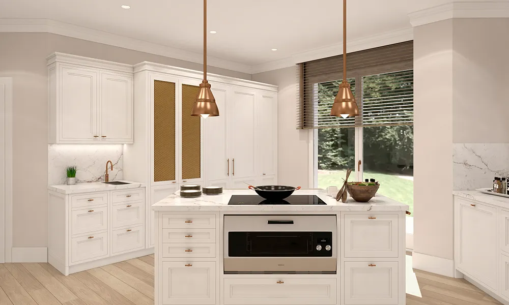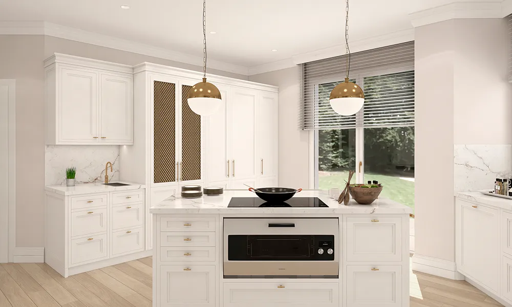 Otra de las opciones, como se puede observar en este render, incluía dos lámparas de diseño para iluminar la isla.
