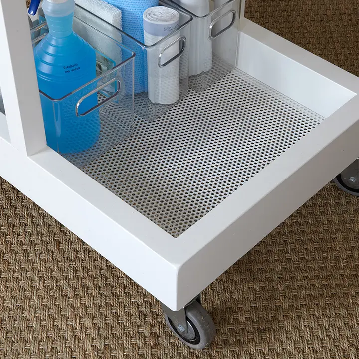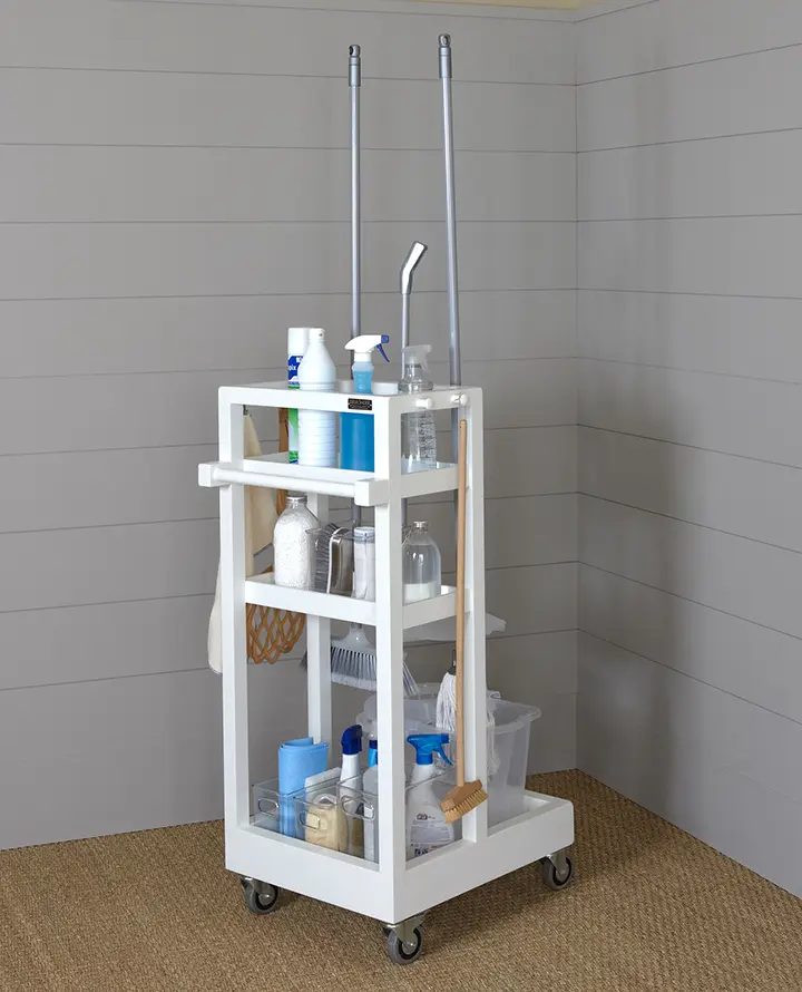 Carro de limpieza en madera de haya lacada o barnizada, estantes con base de aluminio perforado para productos de limpieza con soportes para escobas, paños y otros utensilios.