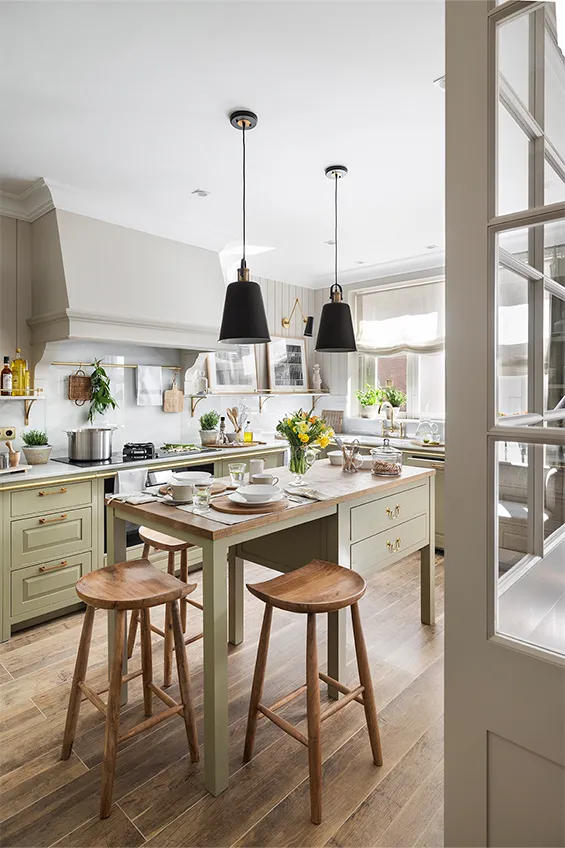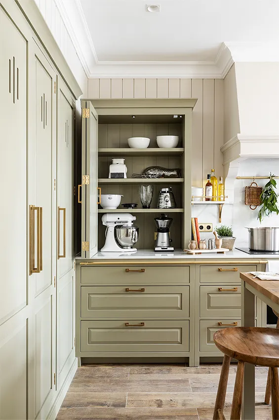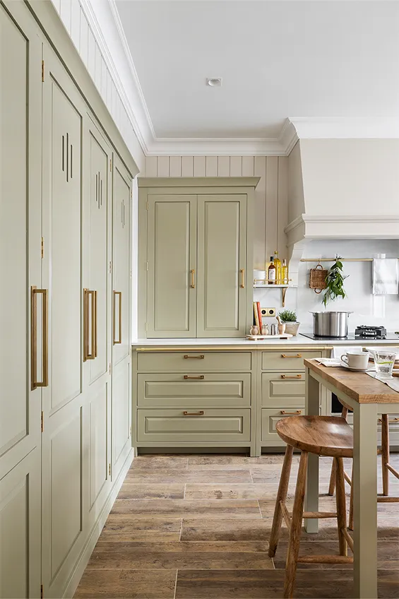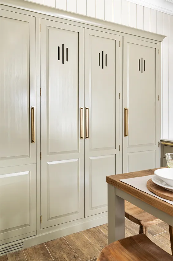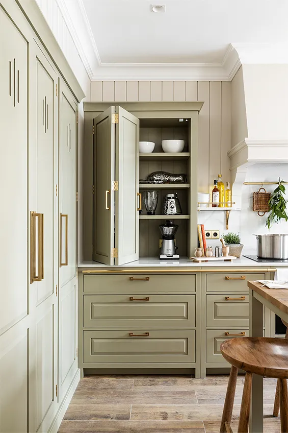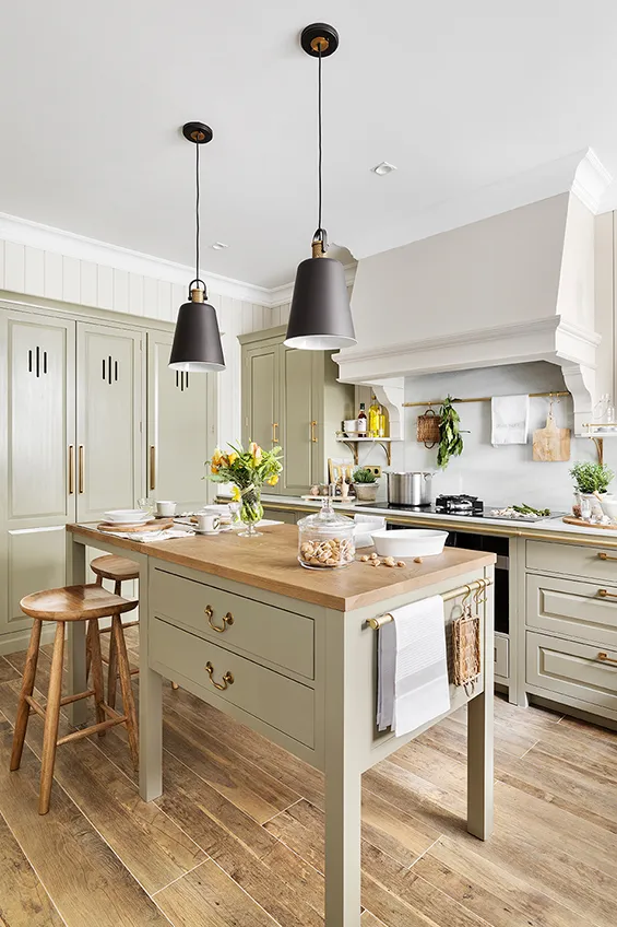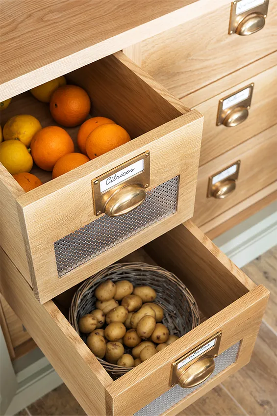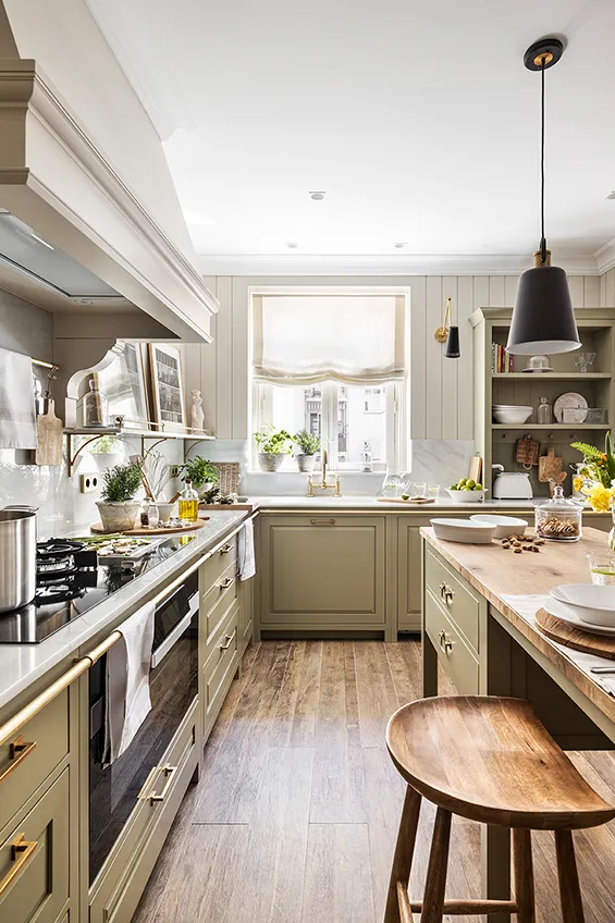 Los muebles de cocina están fabricados en madera maciza pintada a mano y elaborada artesanalmente en los talleres de Deulonder