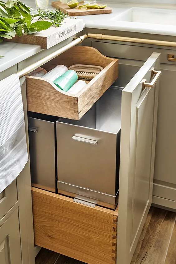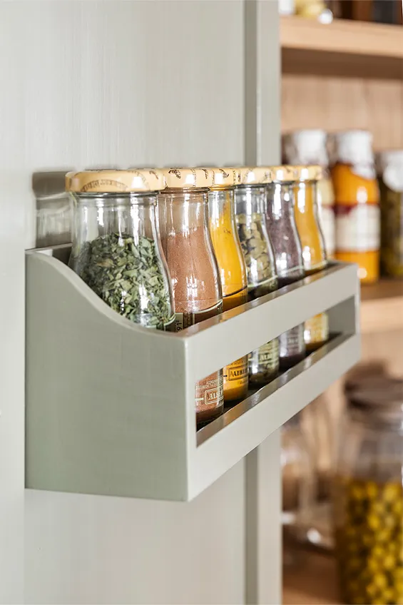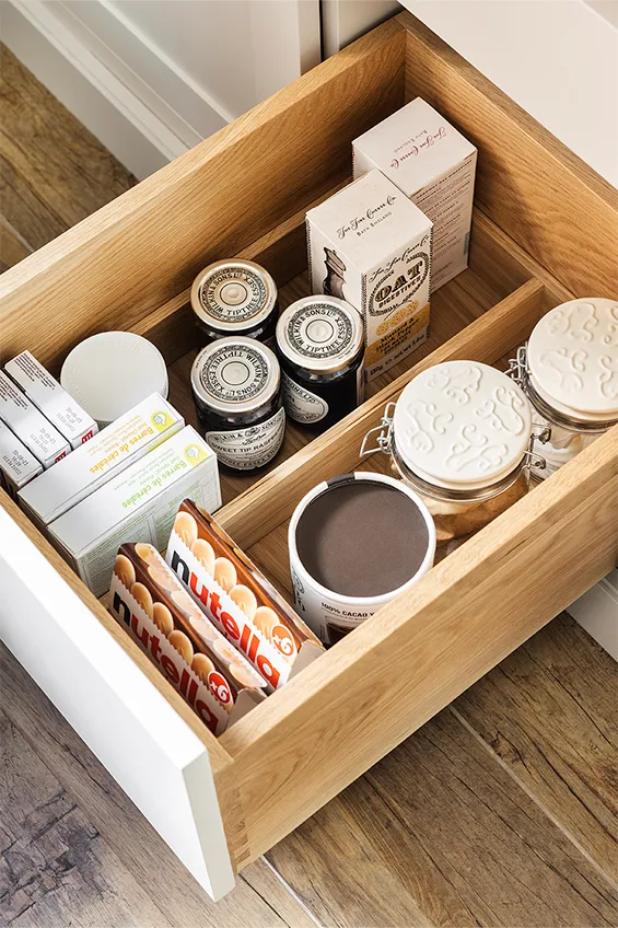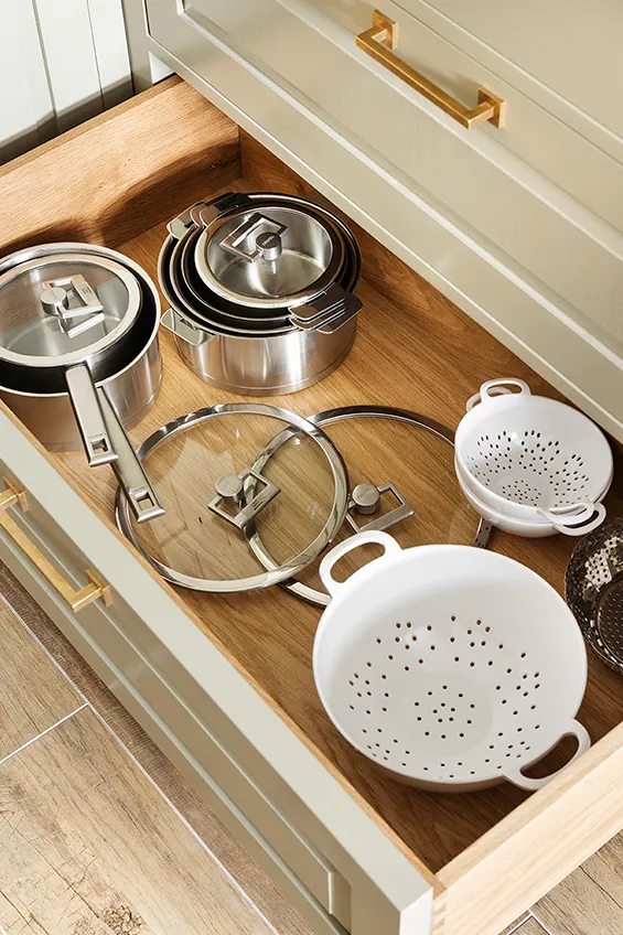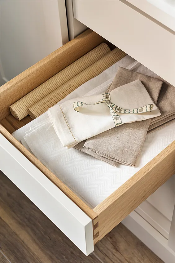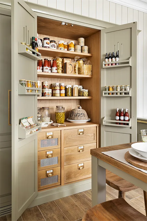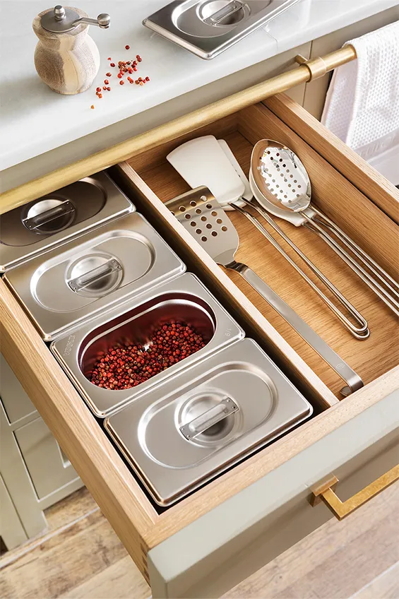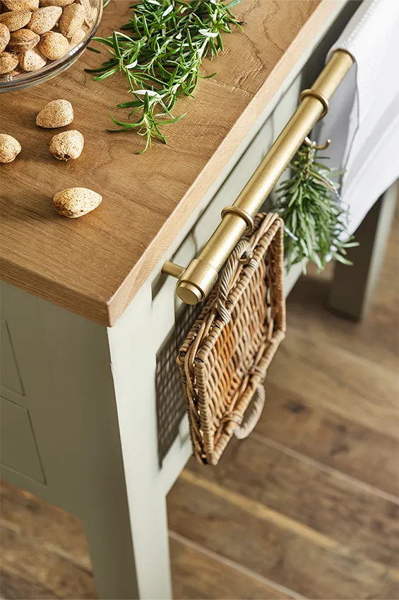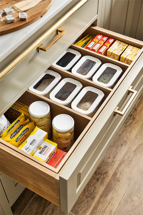 Los muebles de cocina están fabricados en madera maciza pintada a mano y elaborada artesanalmente en los talleres de Deulonder