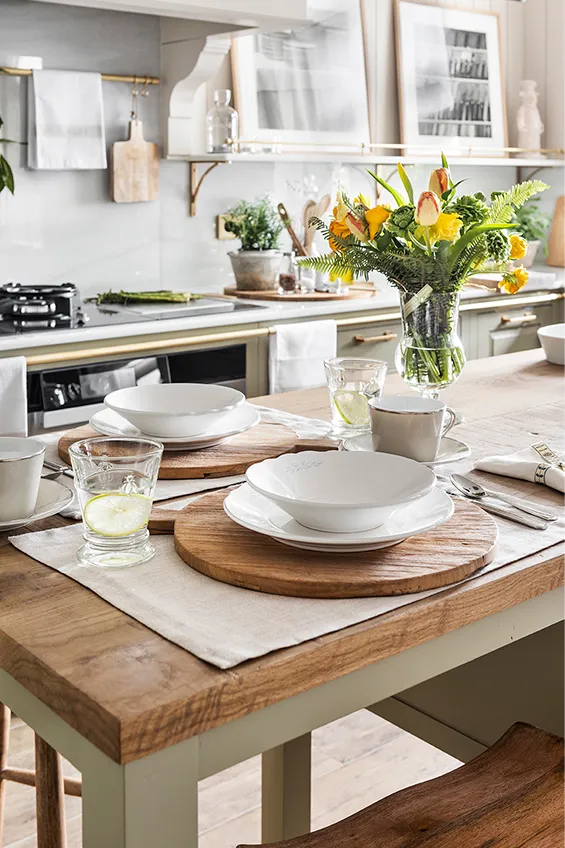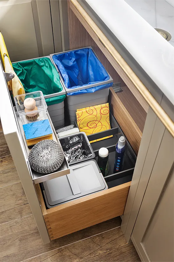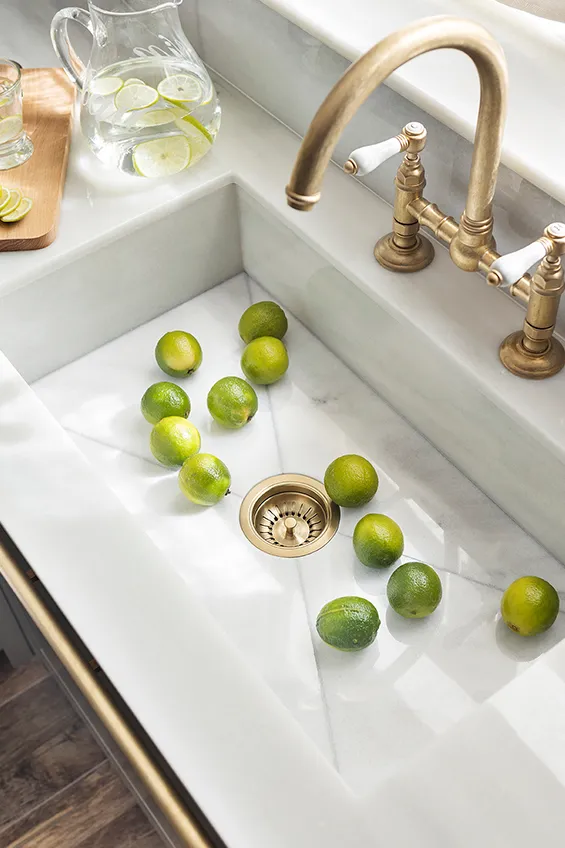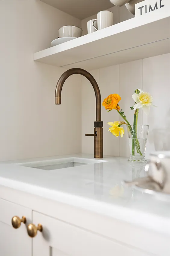 La novedad en 2023 fue que los muebles de cocina estaban fabricados en madera maciza pintada a mano y elaborada artesanalmente en los talleres de Deulonder. Los interiores también eran en madera de roble barnizada. Este sistema de fabricación manual imprime un sello de máxima calidad y ofrece además la enorme ventaja de poder cambiar fácilmente de color si se desea. El pavimento era de parquet cerámico, muy fácil de limpiar y práctico, mientras que las encimeras, de mármol Macael, estaban suministradas por la casa Consentino. Complementos esenciales, como por ejemplo los tiradores y las barras decorativas de latón, eran “Made in London”. Otros elementos decorativos, apliques y lámparas, también provenían del Reino Unido. De ahí también el aire British del espacio, que es lo mismo que decir elegante y sobrio con un toque de modernidad.