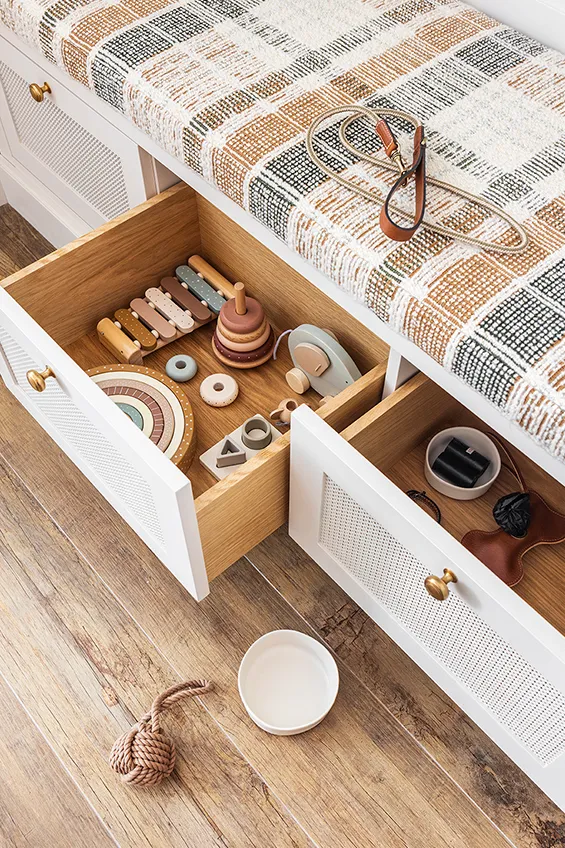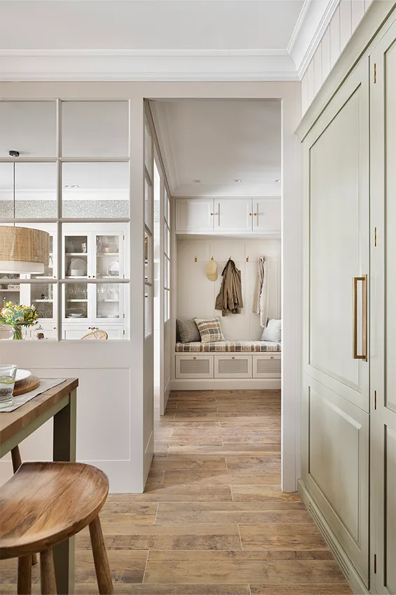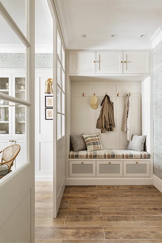 En la entrada del espacio, un banco tapizado con zona para colgar abrigos y chaquetas.