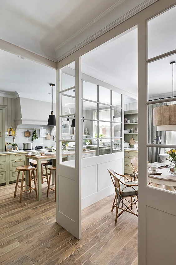 La estancia cuenta con un total de 30m2 y está divida en tres zonas. Un hall de entrada con un mueble perchero; un office dominado por una mesa para comer, con un vajillero y el práctico buffet desayuno y, finalmente, la zona de la cocina totalmente equipada con los electrodomésticos más punteros. La zonificación se ha hecho con mamparas acristaladas blancas, un sistema elegante que permite en todo momento abarcar todo el espacio infundiendo una sensación de amplitud y permitiendo también aprovechar al máximo la luz. Las paredes de la cocina, revestidas con lamas de madera verticales, combinan con los cuarterones de las puertas del mobiliario, y las cornisas superiores de ajuste al techo de Orac Decor.