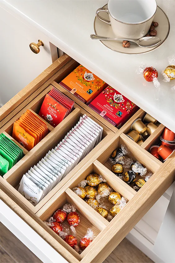 Los seguidores de Deulonder podrán reconocer en la propuesta de Casa Decor del 2023 algunos de los diseños estrella del estudio catalán, como por ejemplo el mueble bufet desayuno, que contiene todo lo necesario para empezar bien el día — cafés, tés, azúcar, pan, cereales…— todo bien dispuesto en cajones diseñados expresamente para cada tipo de alimento. Sin olvidar la imponente campana personalizada fabricada por Deulonder, o el deslumbrante mueble despensa que permite almacenar de manera ordenada y práctica un sinfín de productos de uso cotidiano.